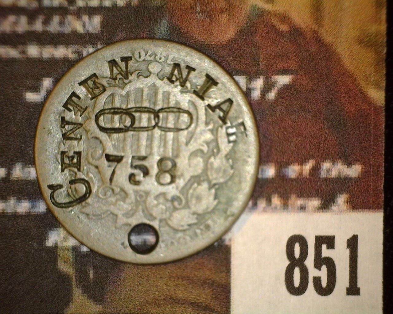 851.1870 Shield Nickel Counter marked by Oddfellows Lodge during the 1919 Centennial "Centennial OOO 758", reverse "OOO", holed.