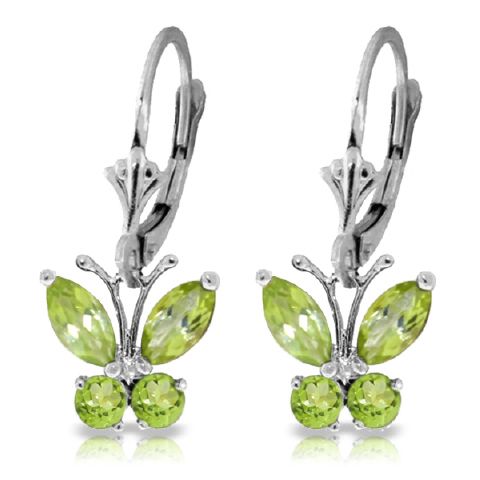 The beautiful light green hue and butterfly design on these 14k solid gold butterfly earrings with peridot makes everyday a beautiful spring day. The solid gold leverbacks on these earrings allow movement to create the illusion of butterflies in flight. Each pair of stunning earrings are made of four marquis cut and four round cut natural peridot stones, which are used to create the glimmering body and shimmering wings of these beautiful pieces. Over one full carat of sparkle makes these earrings dazzle beautifully when catching the light. These earrings make a cute present to showcase the August birthstone. This jewelry piece is shipped in an elegant black jewelry box and is accompanied by an Appraisal Certificate. Retail price: $1572