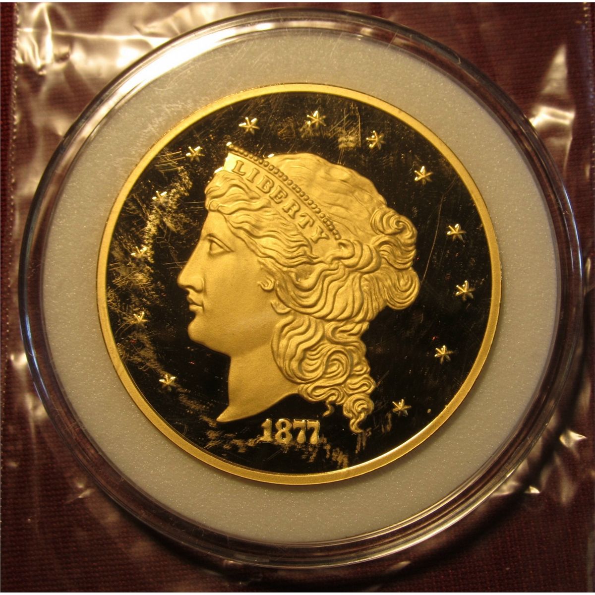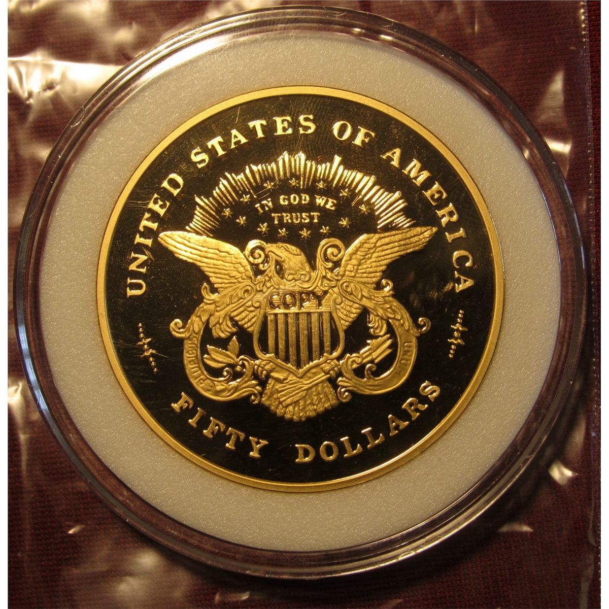 861. MASSIVE replica of a proposed 1877 $50 Gold “Union” gold coin – made from sketches found in the Smithsonian collection, gold-plated, marked COPY