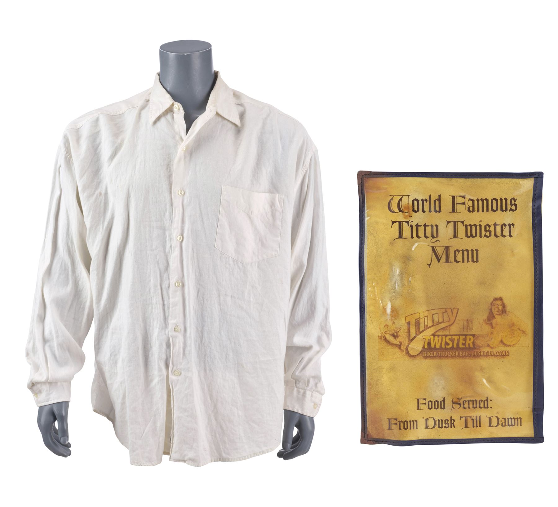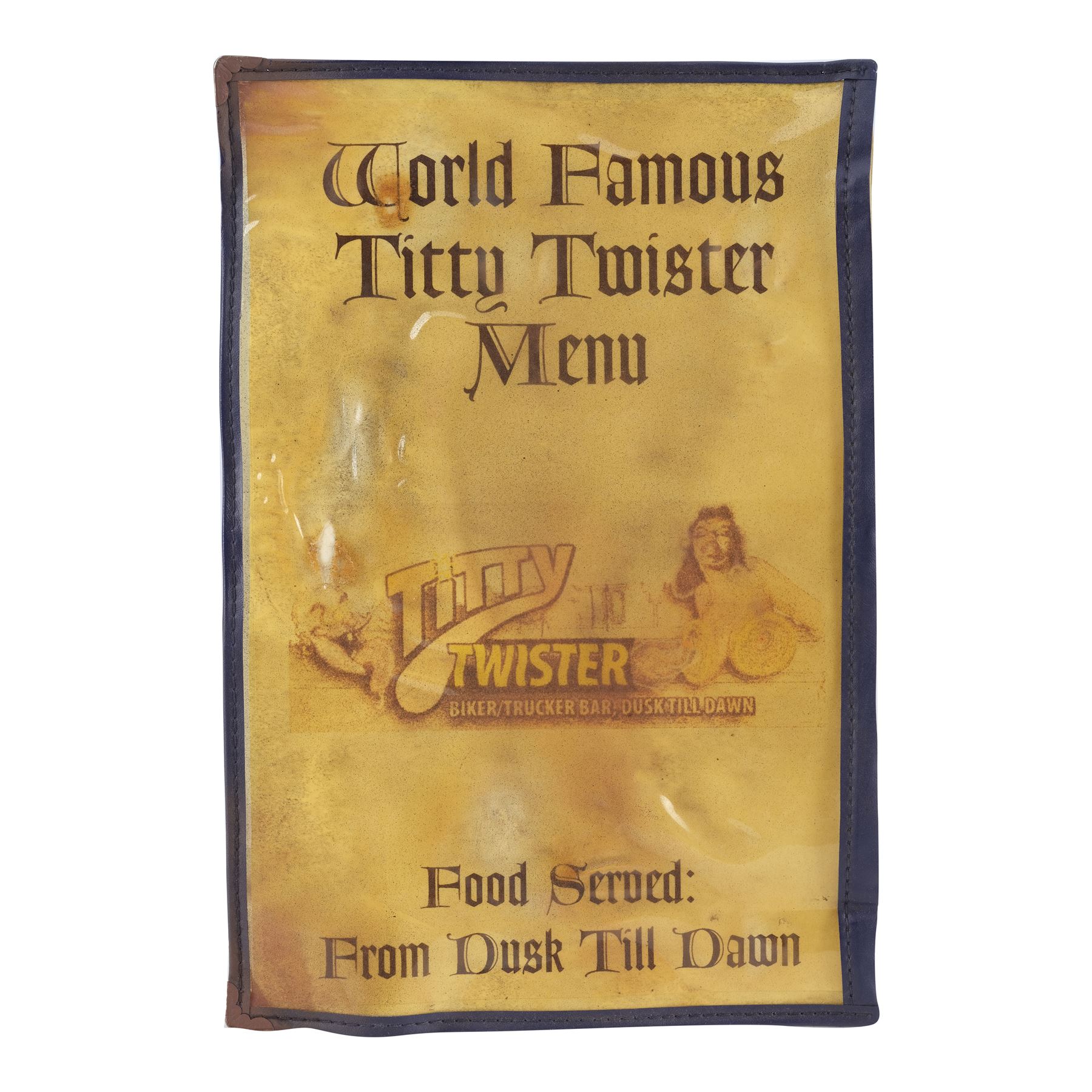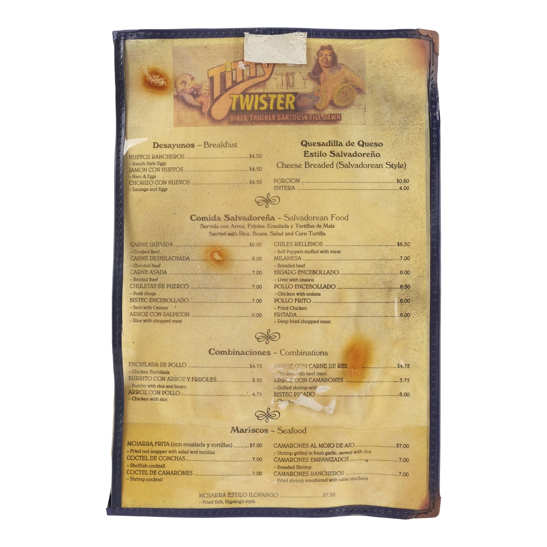 FROM DUSK TILL DAWN (1996) - Richard "Richie" Gecko's (Quentin Tarantino) Shirt and Titty Twister Menu - Richard "Richie" Gecko's (Quentin Tarantino) shirt and Titty Twister menu from Robert Rodriguez action horror film From Dusk Till Dawn.