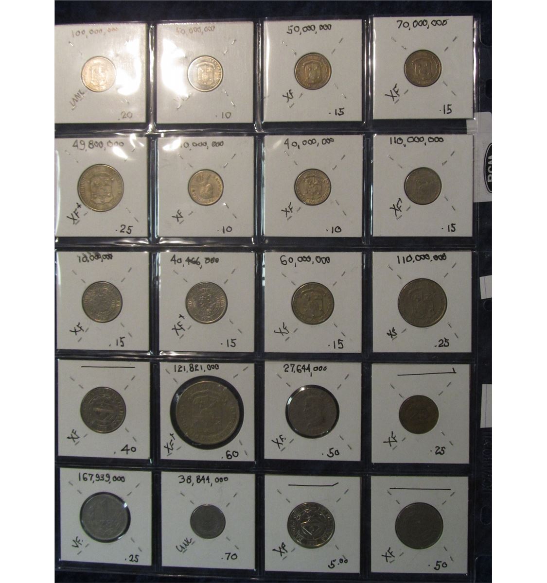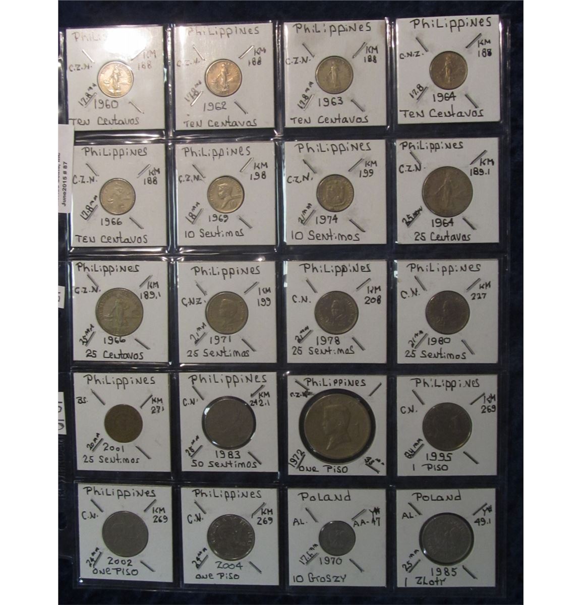 87. (20) World Coins in a Plastic Page identified with KM No., Metal size, & etc. All different. Includes: Philippines & Poland. KM Value on this group is $11.10.