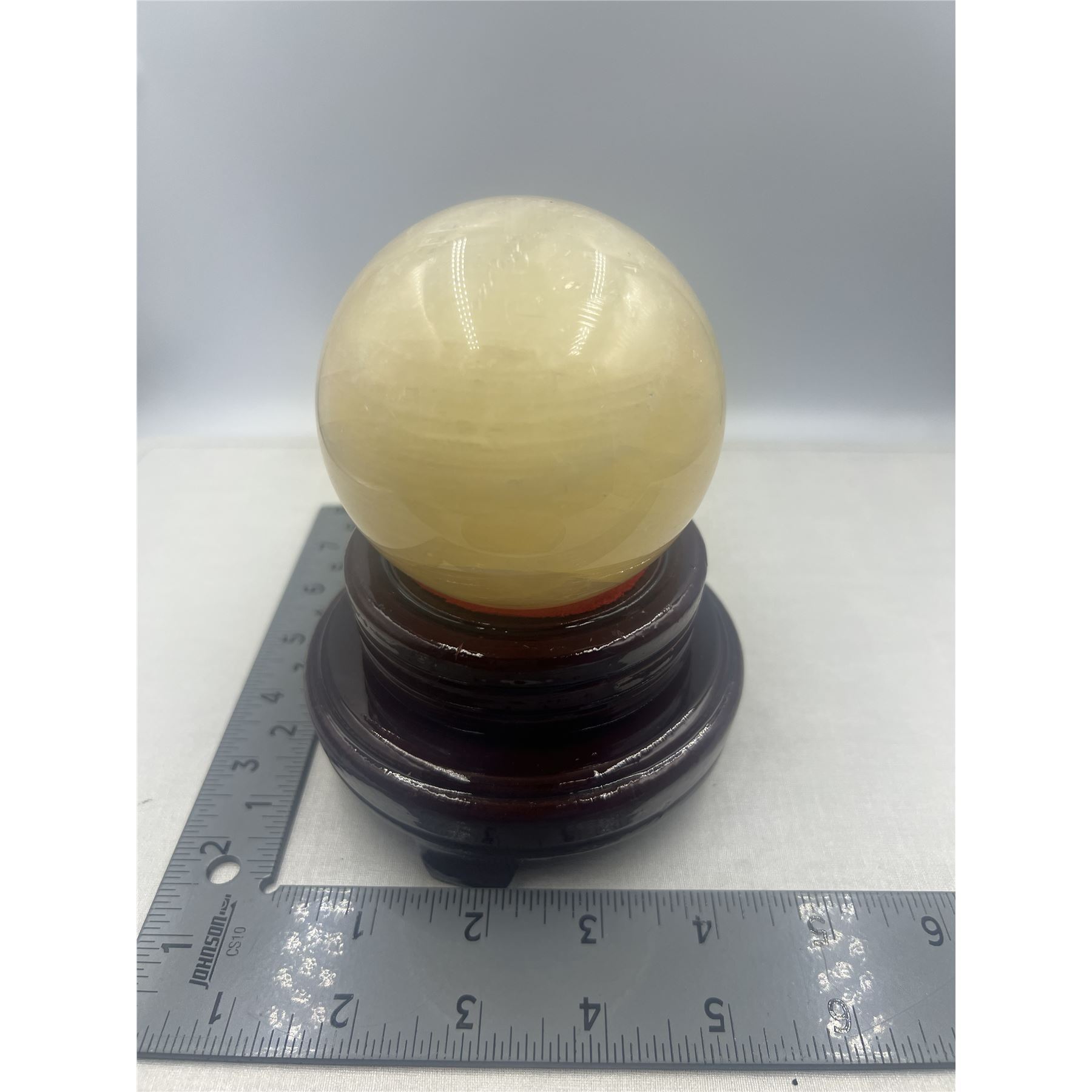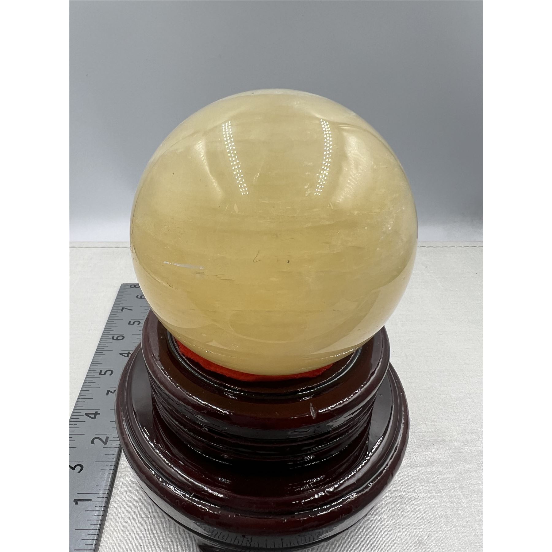 87.3 MM HONEY CALCITE SPHERE WITH STAND .
