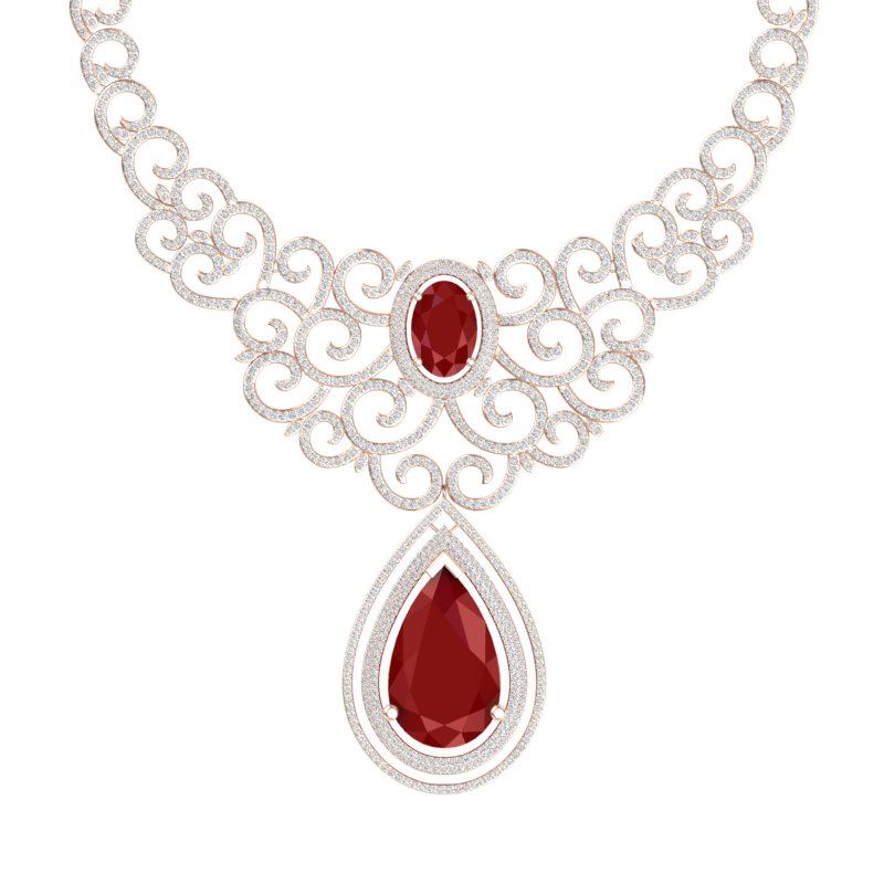 87.52 CTW Royalty Ruby & VS Diamond Necklace 18K Rose Gold ---- Luxury Designer Brand Necklace Appraised Retail Price at $154,000 ---- SKU Number US39840 18K Rose gold Necklace Size is 16 Inches, Can custom fit length, Necklace measuring approx. 4 1/4 x 4 3/4 Inches, weighing in total approx. 83 grams. Made in the USA and is stamped 18K, Main stone 58.6 carat total weight containing 1 pieces of Intense Mid-Opaque Red color with AAA quality Pear shape cut Ruby , Stone #2 15.63 carat total weight containing 1 pieces of Intense Mid-Opaque Red color with AAA quality Oval shape cut