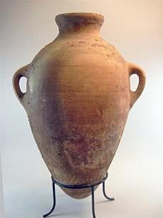 Roman era, of Holy Land manufacture, ca 1st century BC/AD. Very large redware pottery storage vessel of the type used for grains, water, wine or oil, with large rounded base, twin sturdy handles at the shoulders, and slightly flaring rim. Measures an impressive 20"H x 14"D.