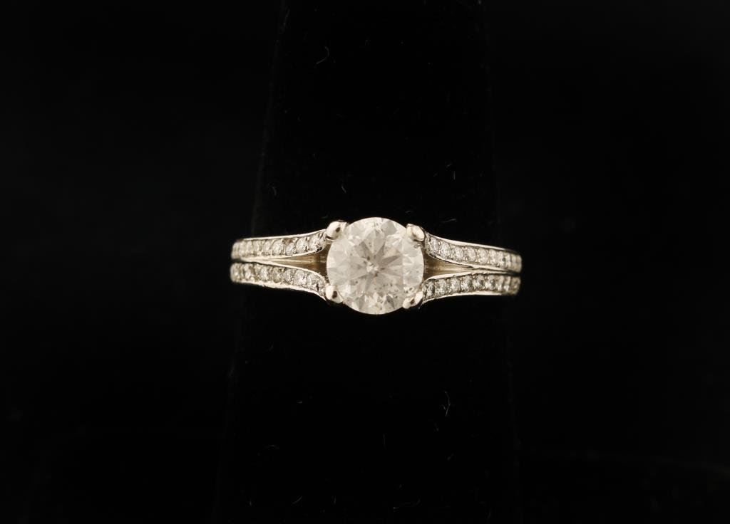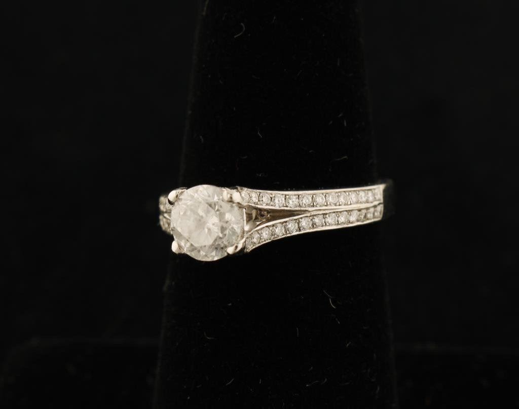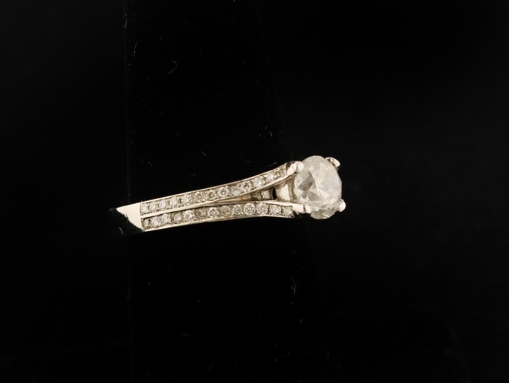 .87 pt. Center Diamond mounted in Platinum with 1.20 accenting Diamonds, appraised F-Color I-2 Clarity by G.G.L. (Westlake, Ca) Retail Replacement value $12,910 Est: $2,500-5,000