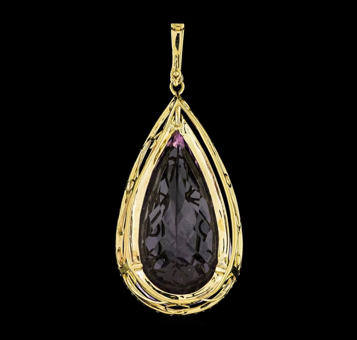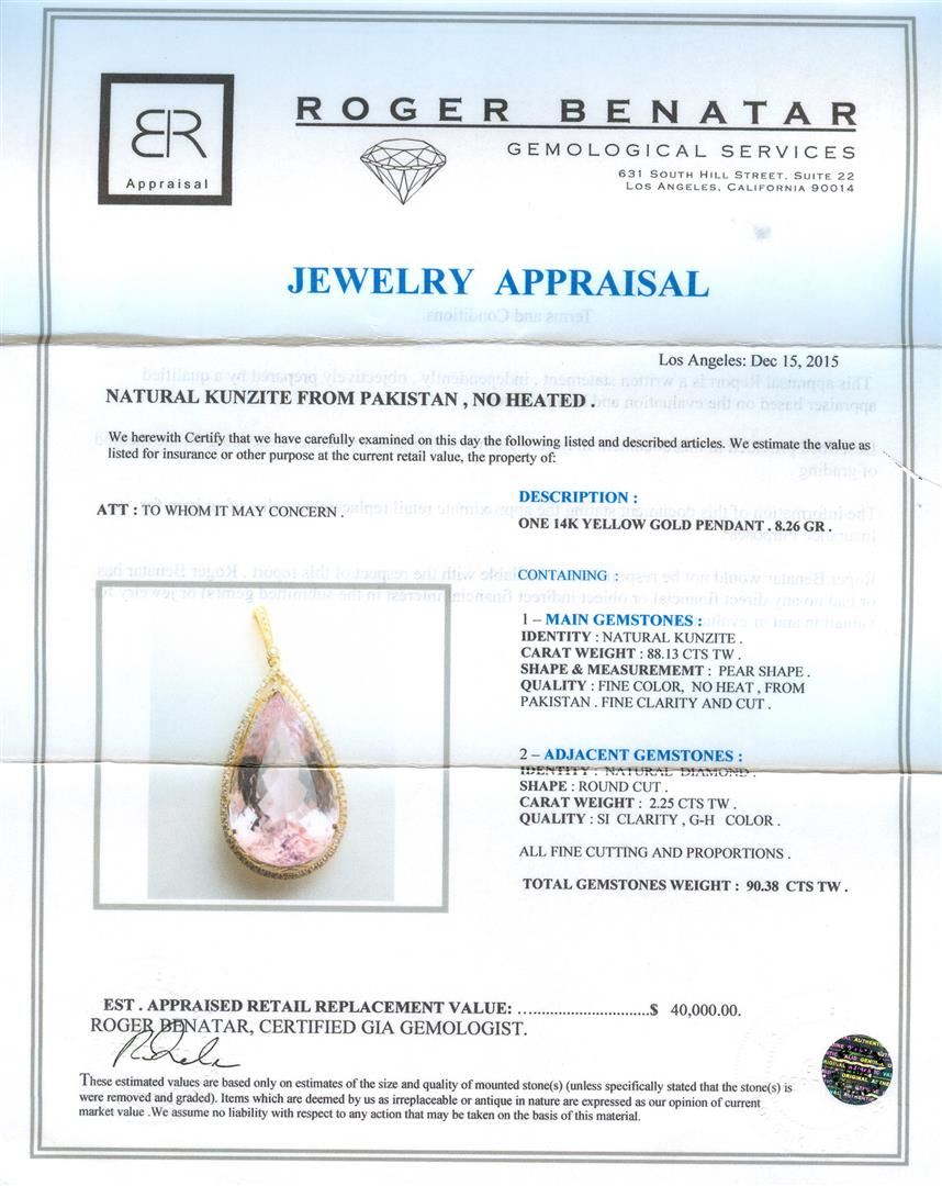 One 14KT Yellow Gold Pendant, 8.26 grams. Containing: Main Gemstones: Identity: Natural Kunzite. Carat Weight: 88.13 cts tw. Shape & Measurement: Pear Shape. Quality: Fine Color, No Heat. From Pakistan. Fine clarity and cut. Adjacent Gemstones: Identity: Natural Diamond. Shape: Round Cut. Carat Weight: 2.25 cts tw. Quality: SI Clarity, G-H Color. All fine cutting and proportions. Total gemstones weight: 90.38 cts tw. RBGS Appraised at $40,000.00.