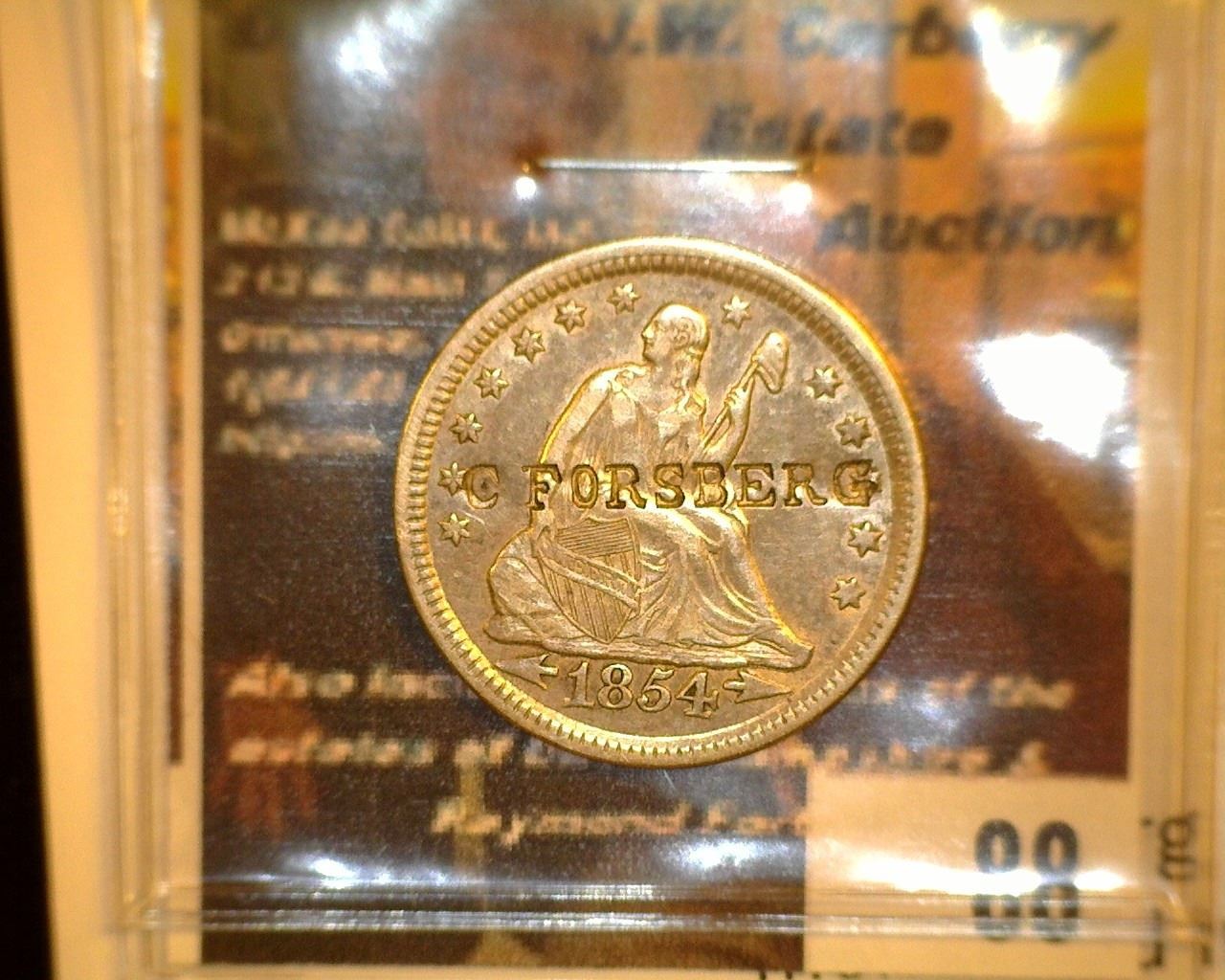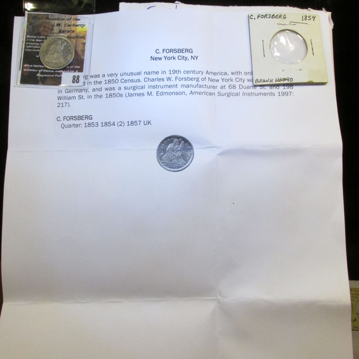 88. 1854 Arrows at date U.S. Seated Liberty Quarter, EF, countermarked "C.FORSBERG", New York City, NY. According to Counterstamp expert and author Gregory Brunk, "Forsberg was a very unusual name in 19th century America, with only six Forsbergs mentioned in the 1850 Census. Charles W. Forsberg of New York City was born c.1802 in Germany, and was a surgical instrument manufacturer at 68 Duane St. and 198 Williams St. in the 1850s (James M. Edmonson, American Surgical Instruments 1997:217)." Only four pieces are known with this countermark, this one, an 1853 & (2) 1857. None of the others are for sale at this time.