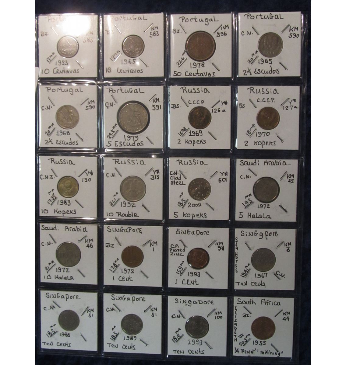 88. (20) World Coins in a Plastic Page identified with KM No., Metal size, & etc. All different. Includes: Portugal, Russia, Saudi Arabia, Singapore, & South Africa. KM Value on this group is $16.75.