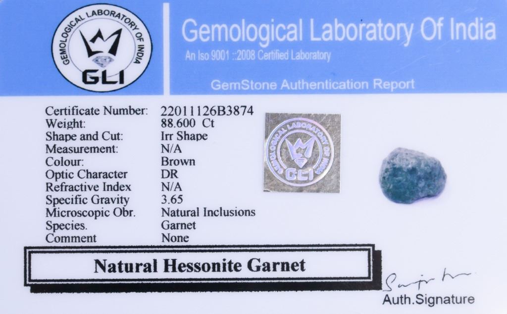 88.60 ct irregular shape roung brown natural hessonite garnet. Accompanied with GLI certificate.