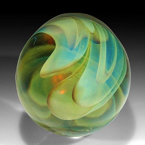 Gilbert Johnson 1972 high-domed abstract design paperweight, with swirling amber veils. Signed/dated. Diameter 2 1/4". NO RESERVE