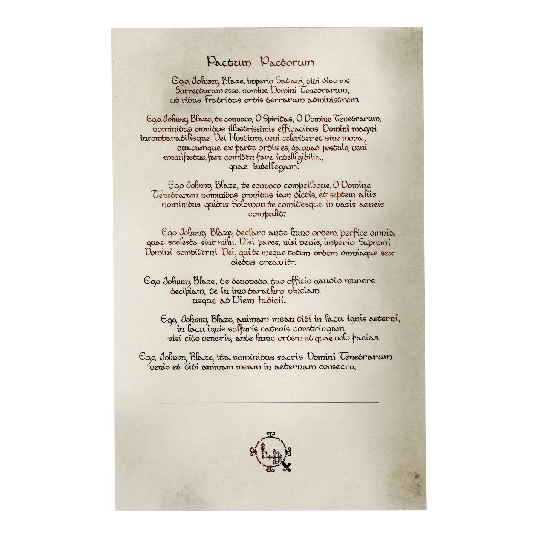This contract features printed Latin text in various shades of black and brown on cream color textured paper. The bottom of the contract contains a goetic-like sigil for "LD." Production intentionally distressed this contract. This lot exhibits minor creasing along the edges. Dimensions: 9.5" x 14.5" (24.25 cm x 37 cm)