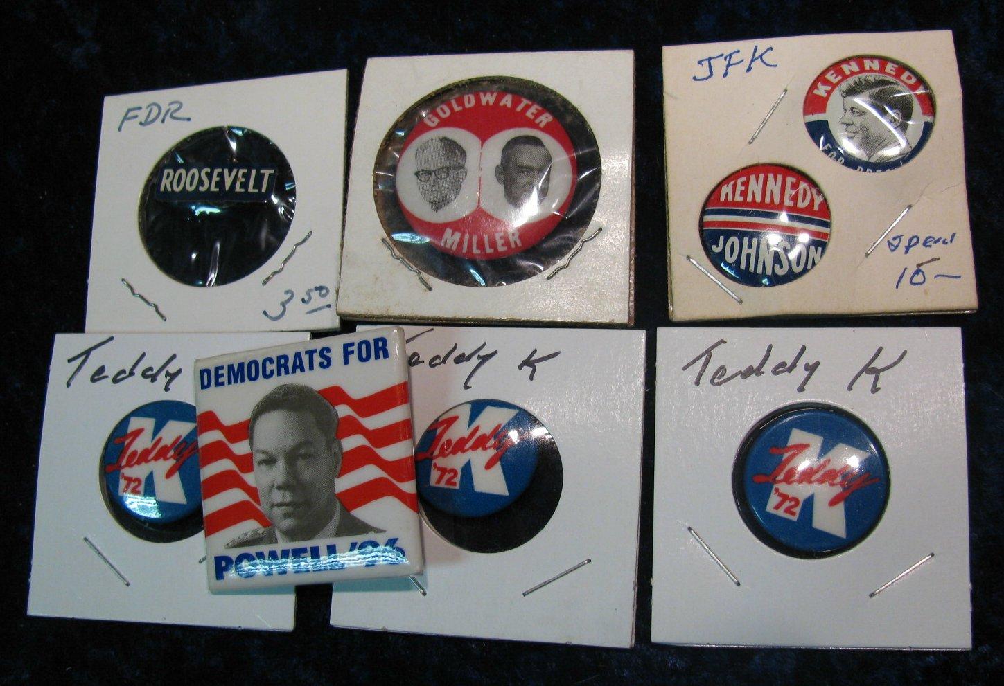 889. (8) Presidential Campaign Political Buttons, badges, etc. Includes Goldwater, J.F. Kennedy, Roosevelt, Powell, & Teddy Kennedy.