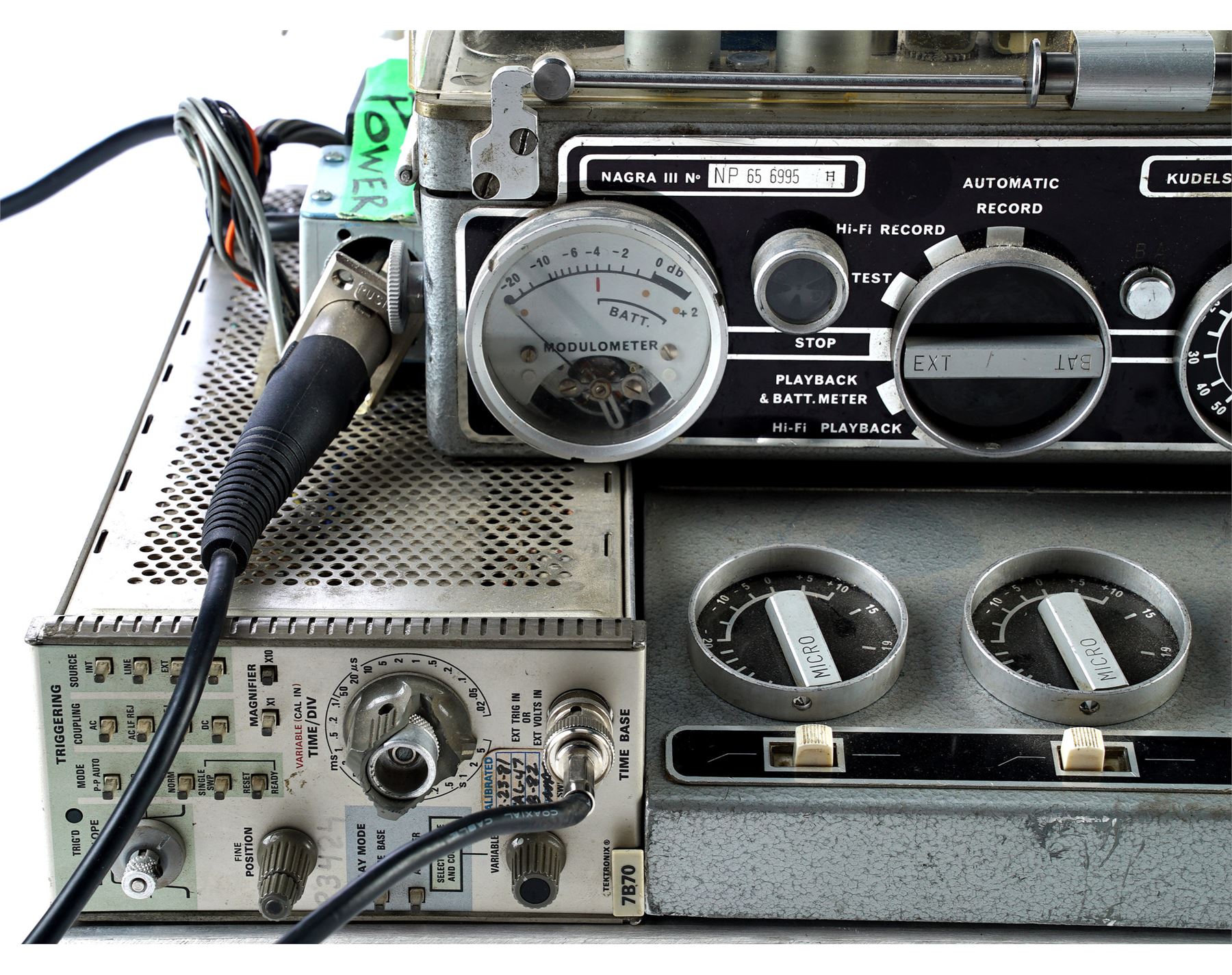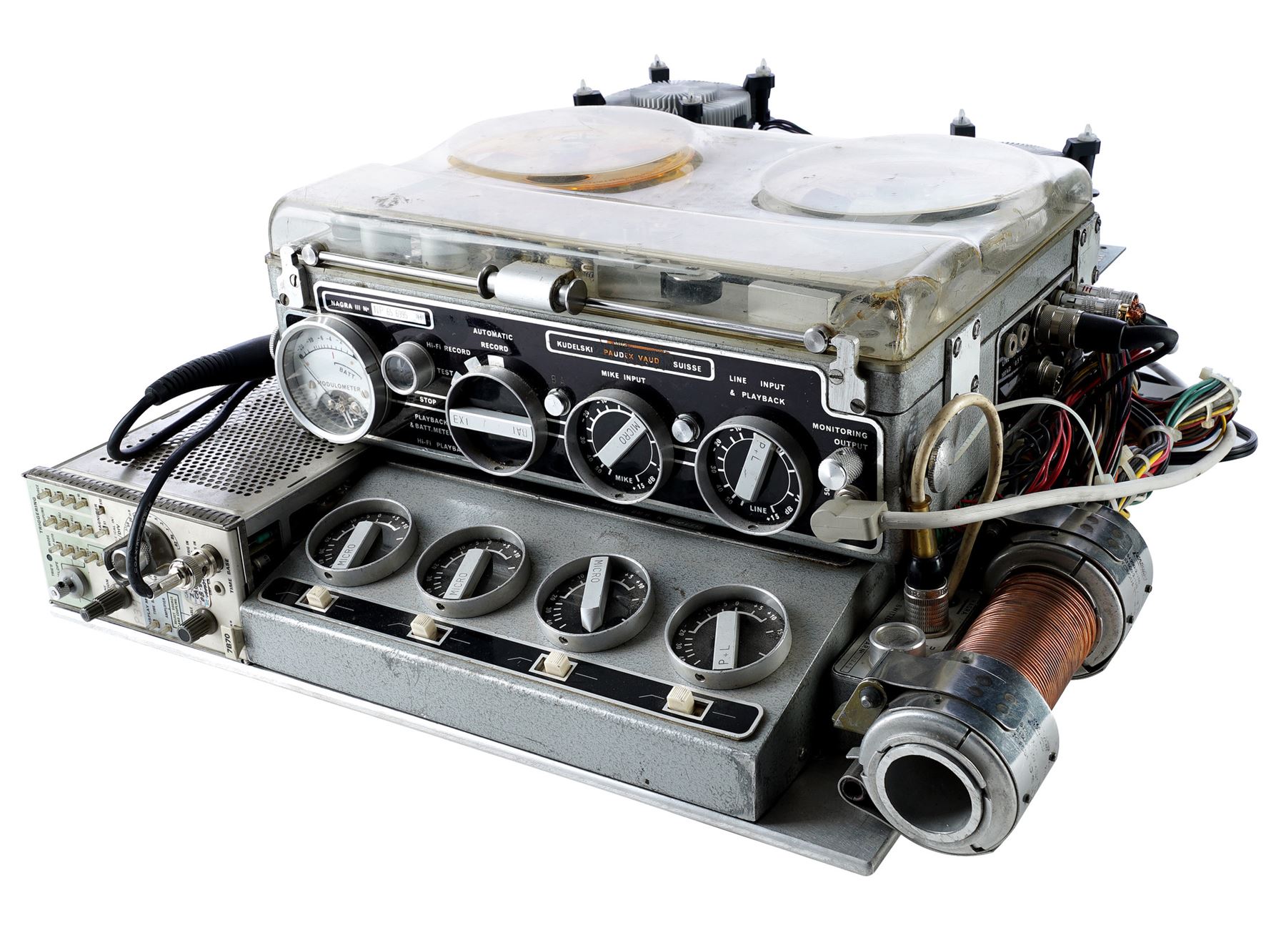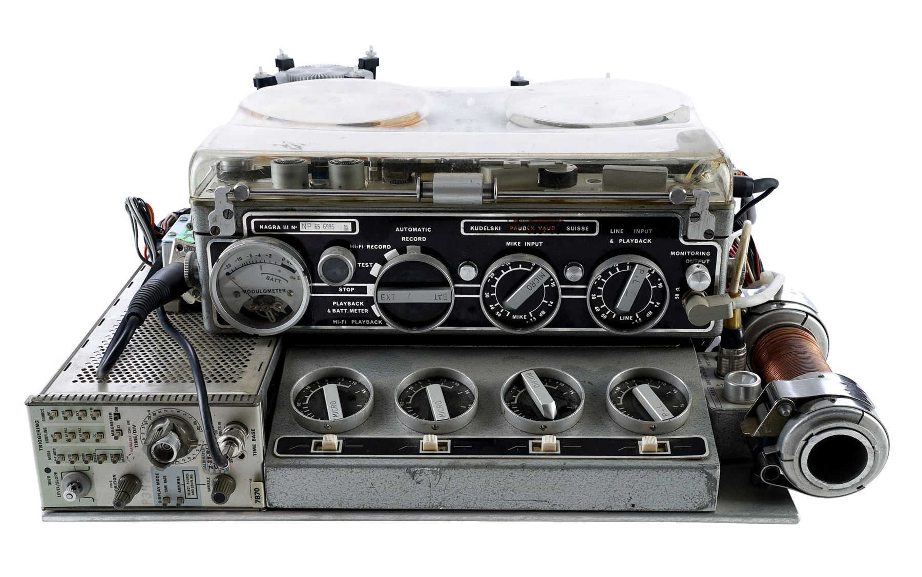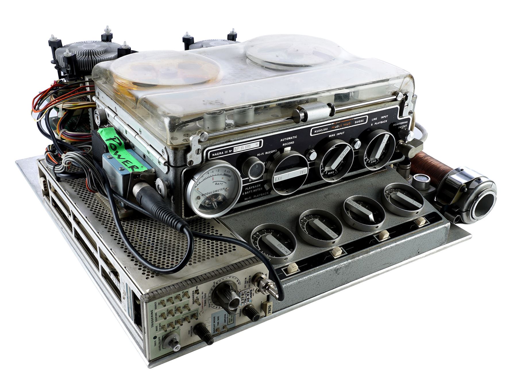 This Kudelski Nagra III recorder (with supply and take-up reels in place) is attached to a metal base with various switches and knobs, and adhered tech elements including circuit boards and computer fans. The base features red and green lights illuminated by a switch on the left side of the recorder with an attached power cord. While the lighting effects function, the recorder itself does not at this time. Various audio cables run from the recorder, two of which have been cut. Two additional cables are also included. The recorder exhibits some loose or unattached elements. Dimensions: 20" x 18" x 10" (51 cm x 45.75 cm x 25.5 cm)