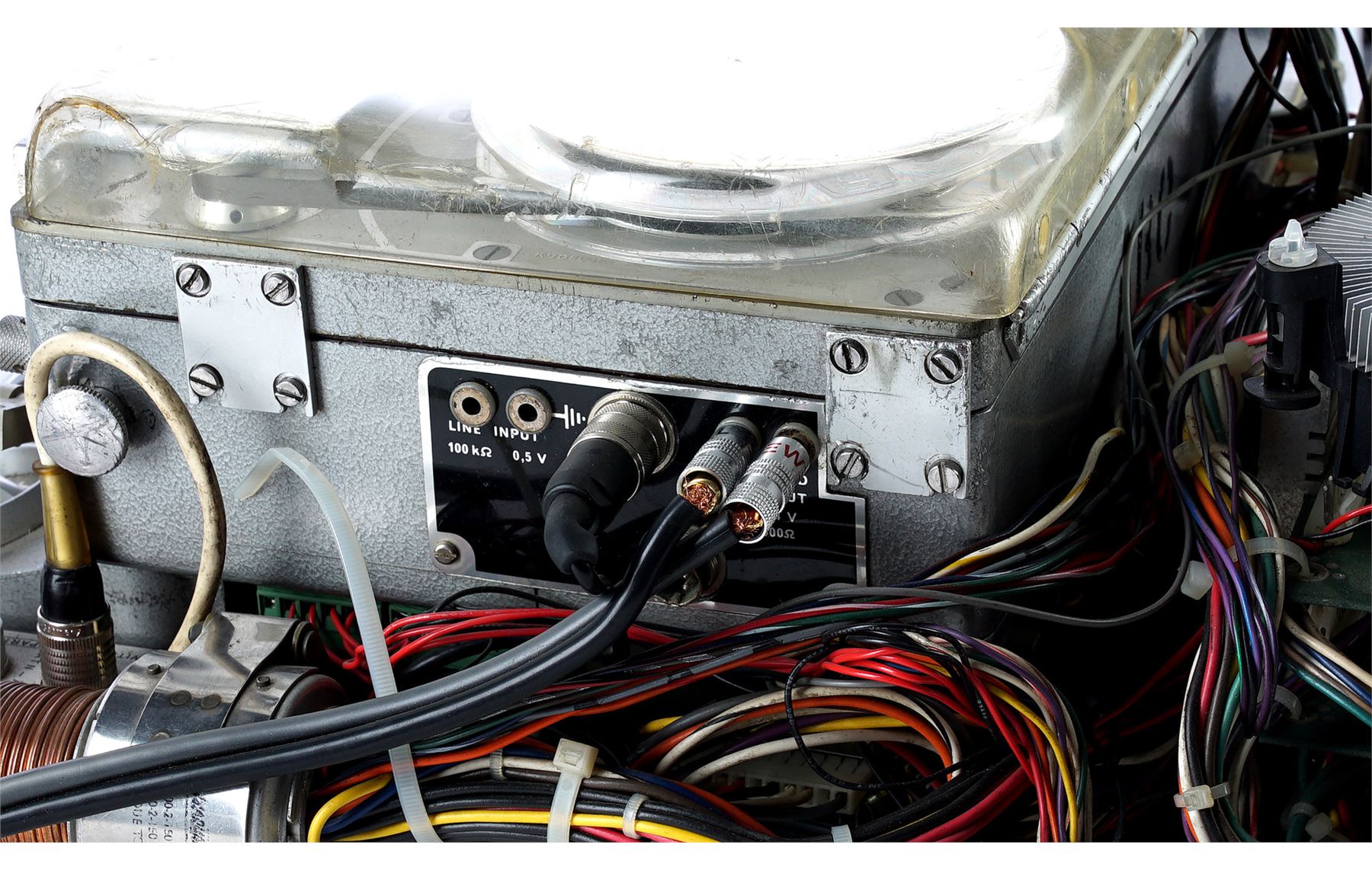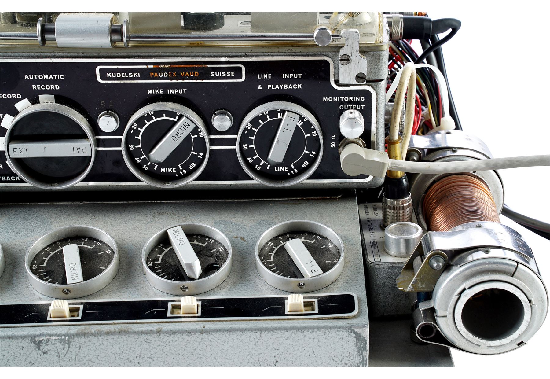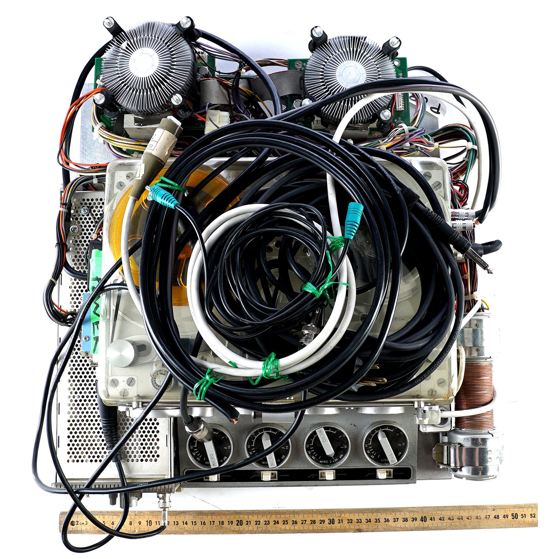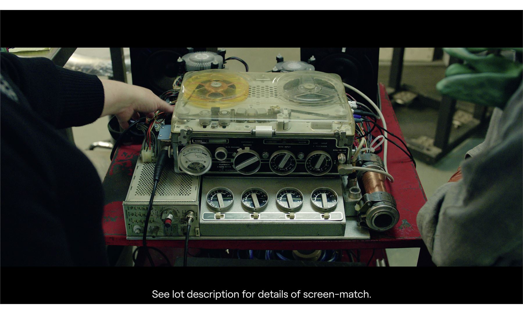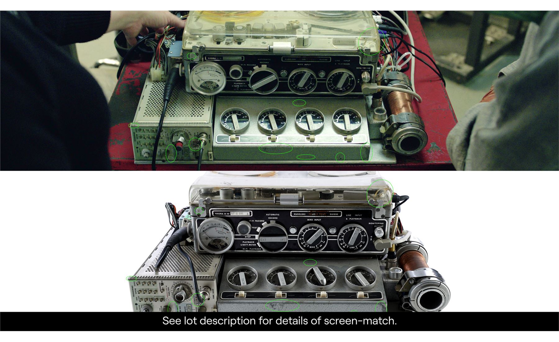 This Kudelski Nagra III recorder (with supply and take-up reels in place) is attached to a metal base with various switches and knobs, and adhered tech elements including circuit boards and computer fans. The base features red and green lights illuminated by a switch on the left side of the recorder with an attached power cord. While the lighting effects function, the recorder itself does not at this time. Various audio cables run from the recorder, two of which have been cut. Two additional cables are also included. The recorder exhibits some loose or unattached elements. Dimensions: 20" x 18" x 10" (51 cm x 45.75 cm x 25.5 cm)