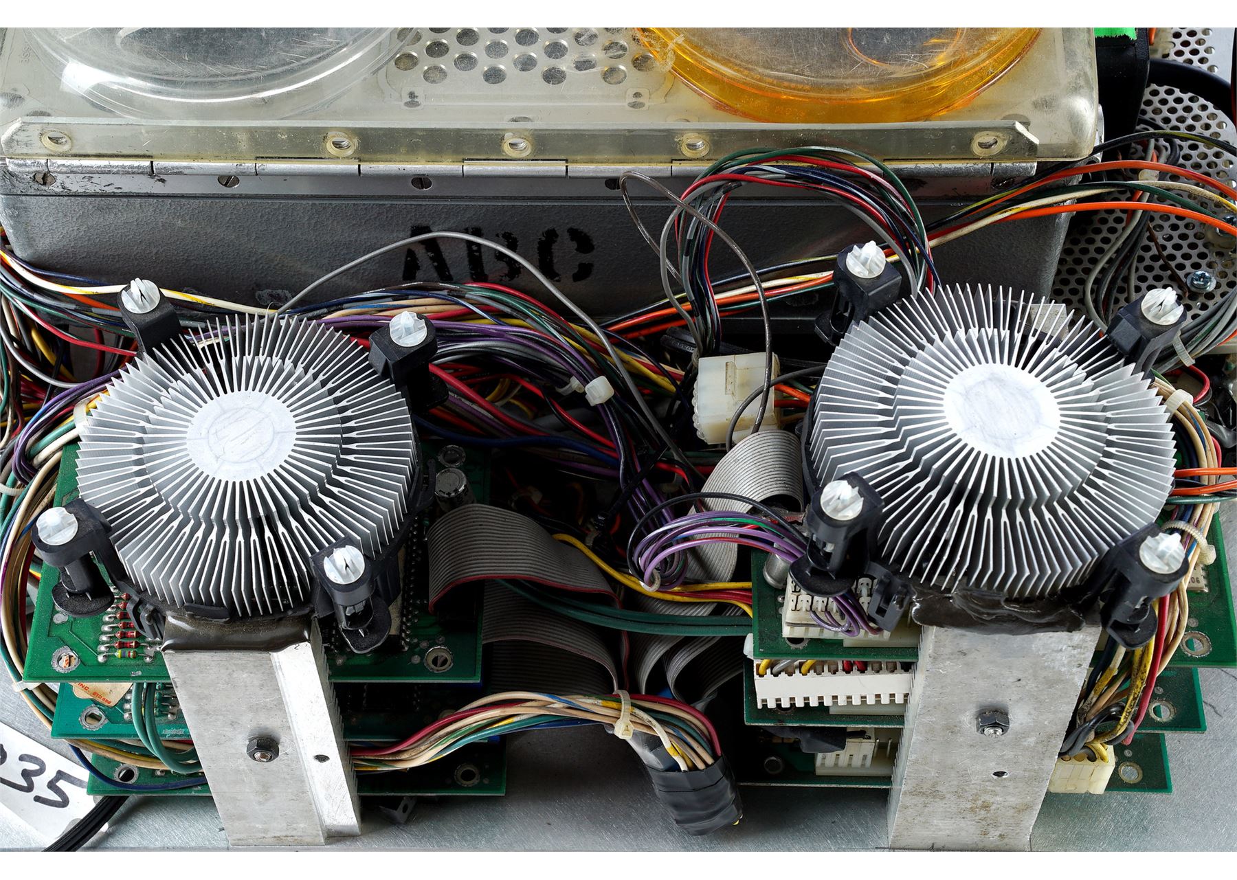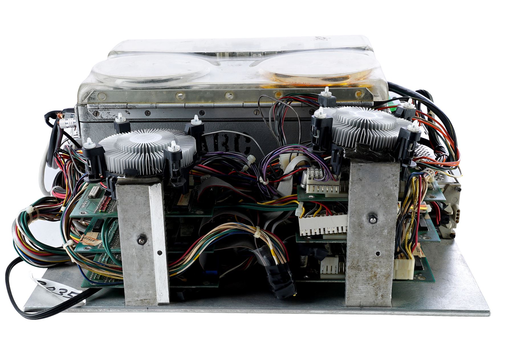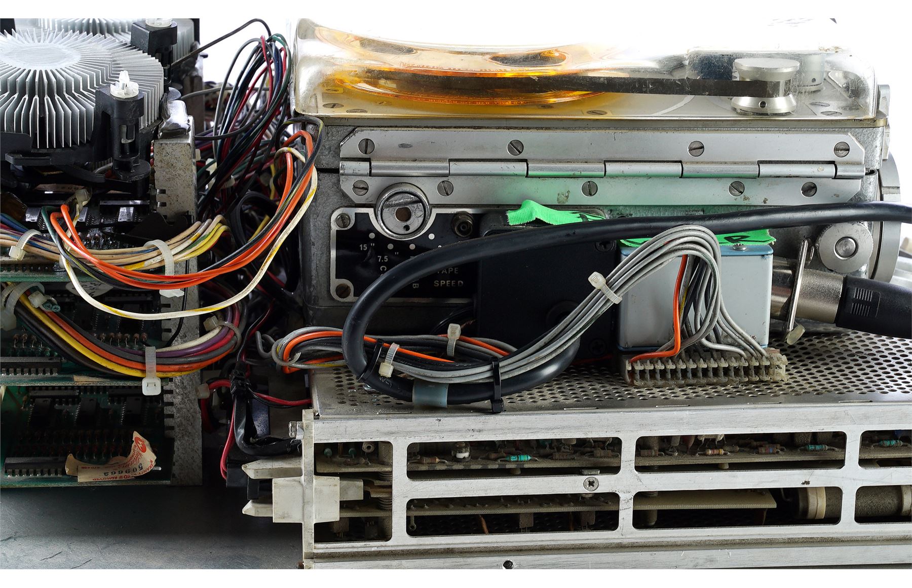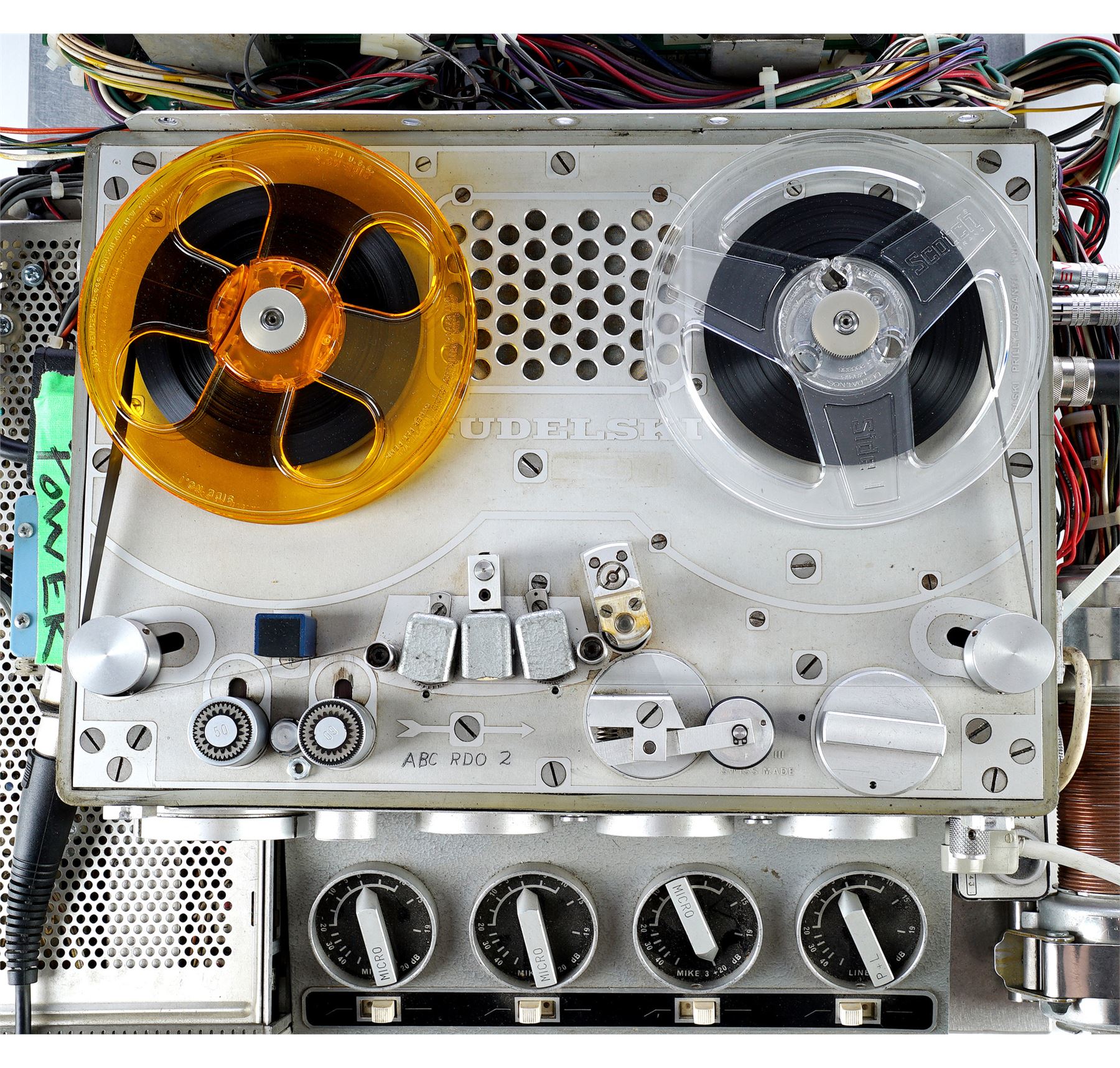 This Kudelski Nagra III recorder (with supply and take-up reels in place) is attached to a metal base with various switches and knobs, and adhered tech elements including circuit boards and computer fans. The base features red and green lights illuminated by a switch on the left side of the recorder with an attached power cord. While the lighting effects function, the recorder itself does not at this time. Various audio cables run from the recorder, two of which have been cut. Two additional cables are also included. The recorder exhibits some loose or unattached elements. Dimensions: 20" x 18" x 10" (51 cm x 45.75 cm x 25.5 cm)