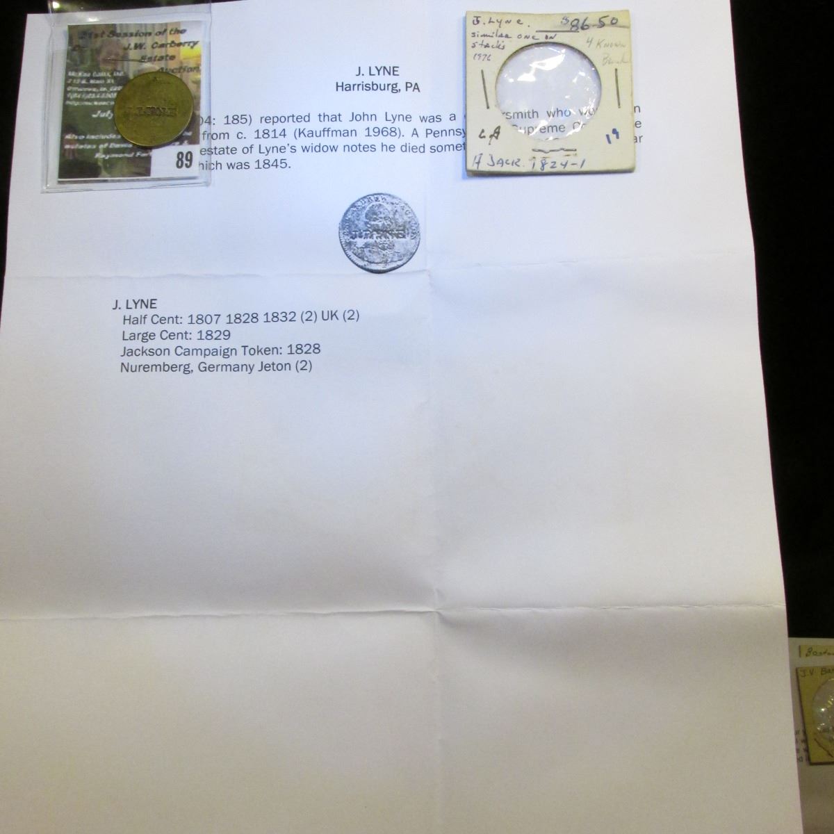 89. Genl. Andrew Jackson Campaign token with "J.LYNE' countermark, Harrisburg, Pa. According to Counterstamp expert and author Gregory Brunk, "Rulau (2004:185) reported that John Lyne was a coppersmith who worked in Harrisburg in from c.1814 (Kauffman 1968). A Pennsylvania Supreme Court Case regarding the estate of Lyne's widow notes he died sometime after 1838 and the year of the case, which was 1845. This is the only specimen known to be struck on a Campaign Token.