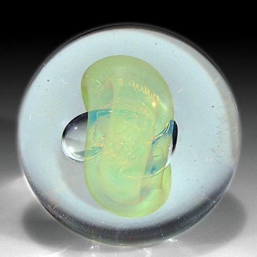 Gilbert Johnson 1972 low-domed abstract design paperweight, with two folded amber veils partially covering two central bubbles. Signed/dated. Rough pontil. Diameter 2 3/4". NO RESERVE