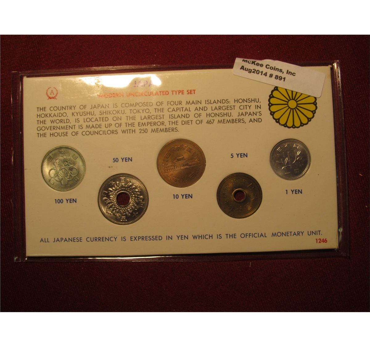 891. Japan Modern Uncirculated Type Set, 5 coin set, 100 Yen coin is silver, circa 1964-1965