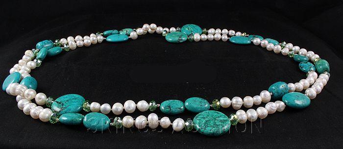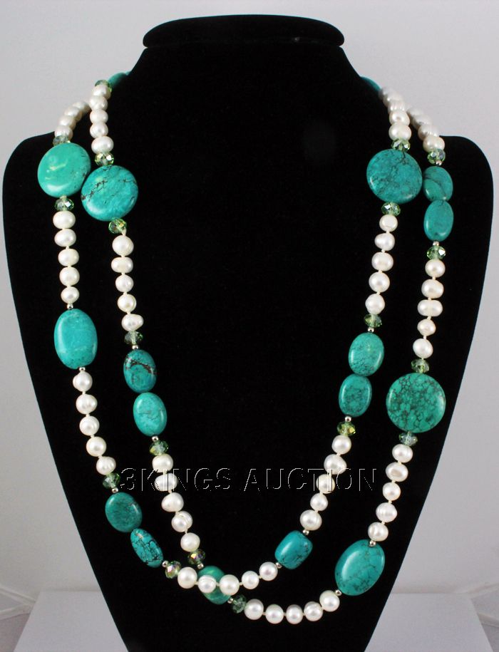 894.00ctw Holiday Party Beaded TurquoiseSilverNecklace **|**|** Long strand 27" Quality Turquoise, Rice Pearls and Lemon Green Beads Sterling Silver Necklace, Silk/Nylon Thread ; MSRP: $600