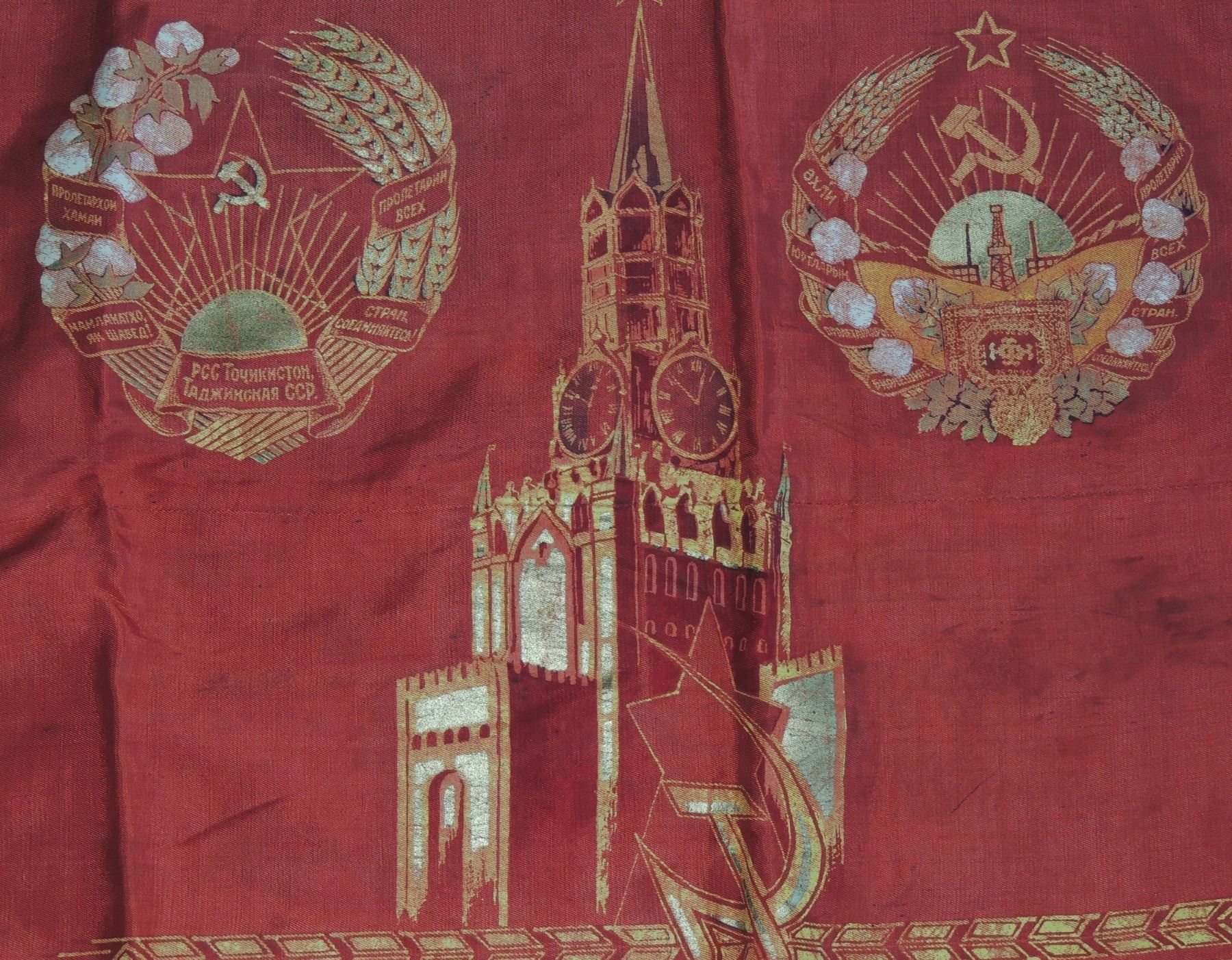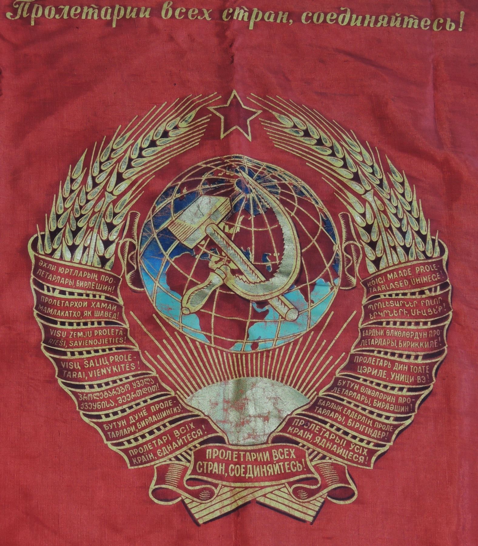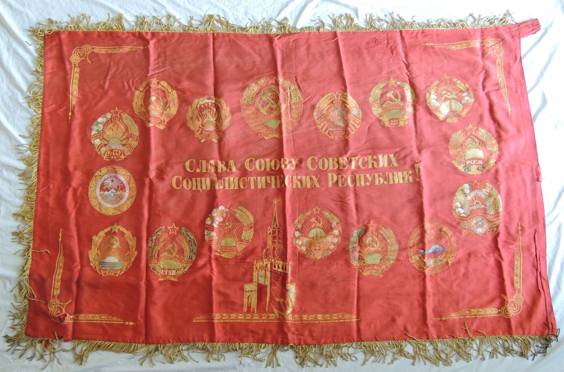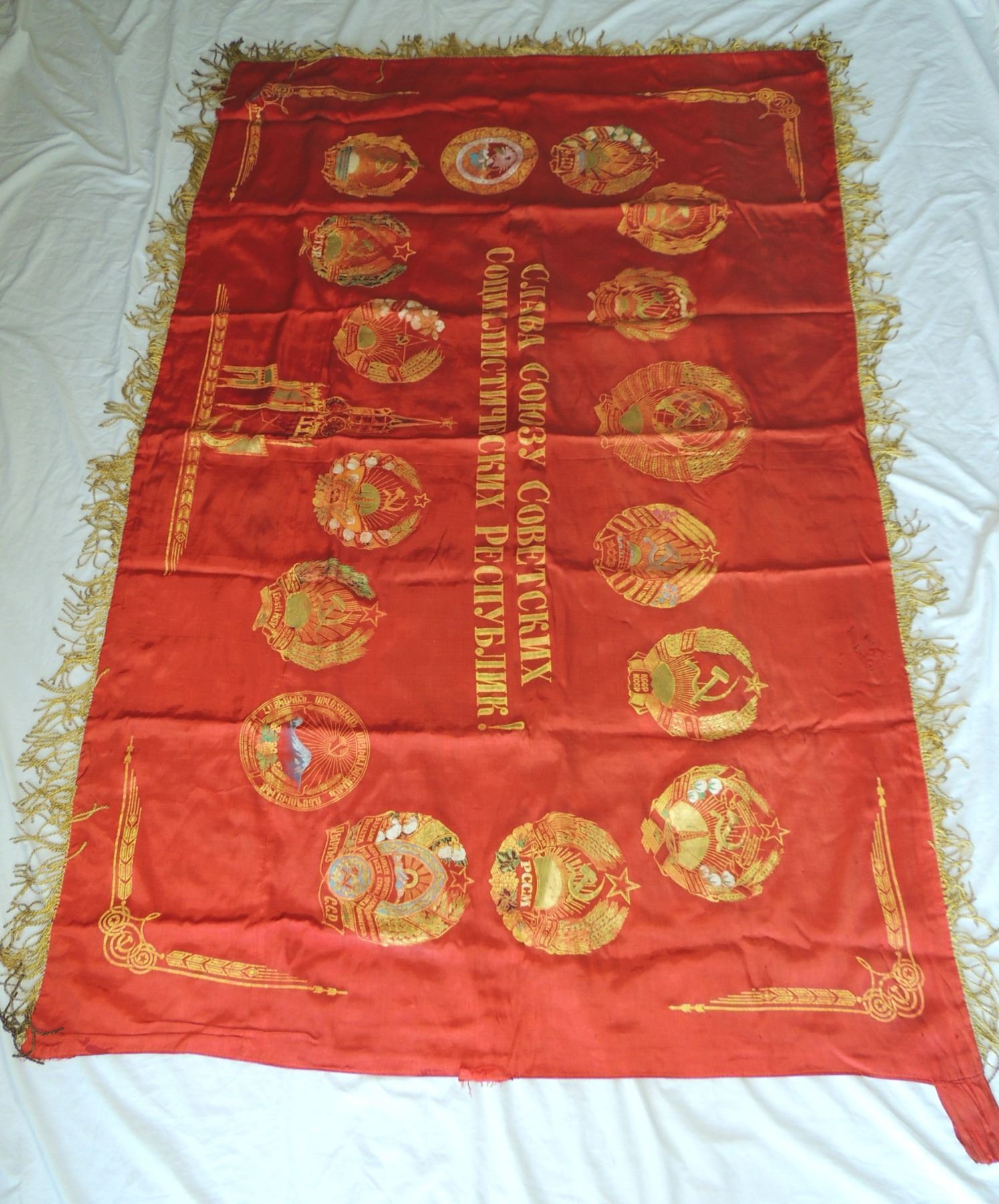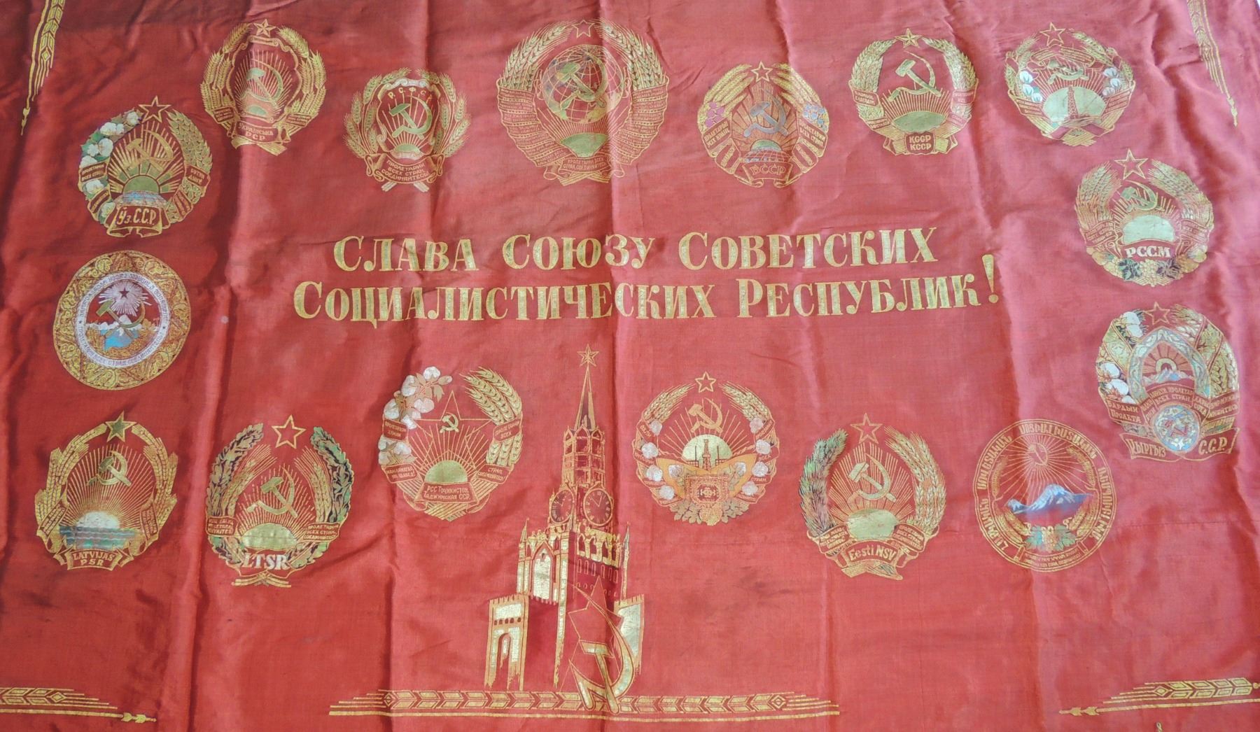 66X44 INCHES IN SIZE LARGE BANNER DOUBLE SIDED WITH SOVIET STATES HAS WEAR COLD WAR ERA COMMUNIST RUSSIAN FLAG