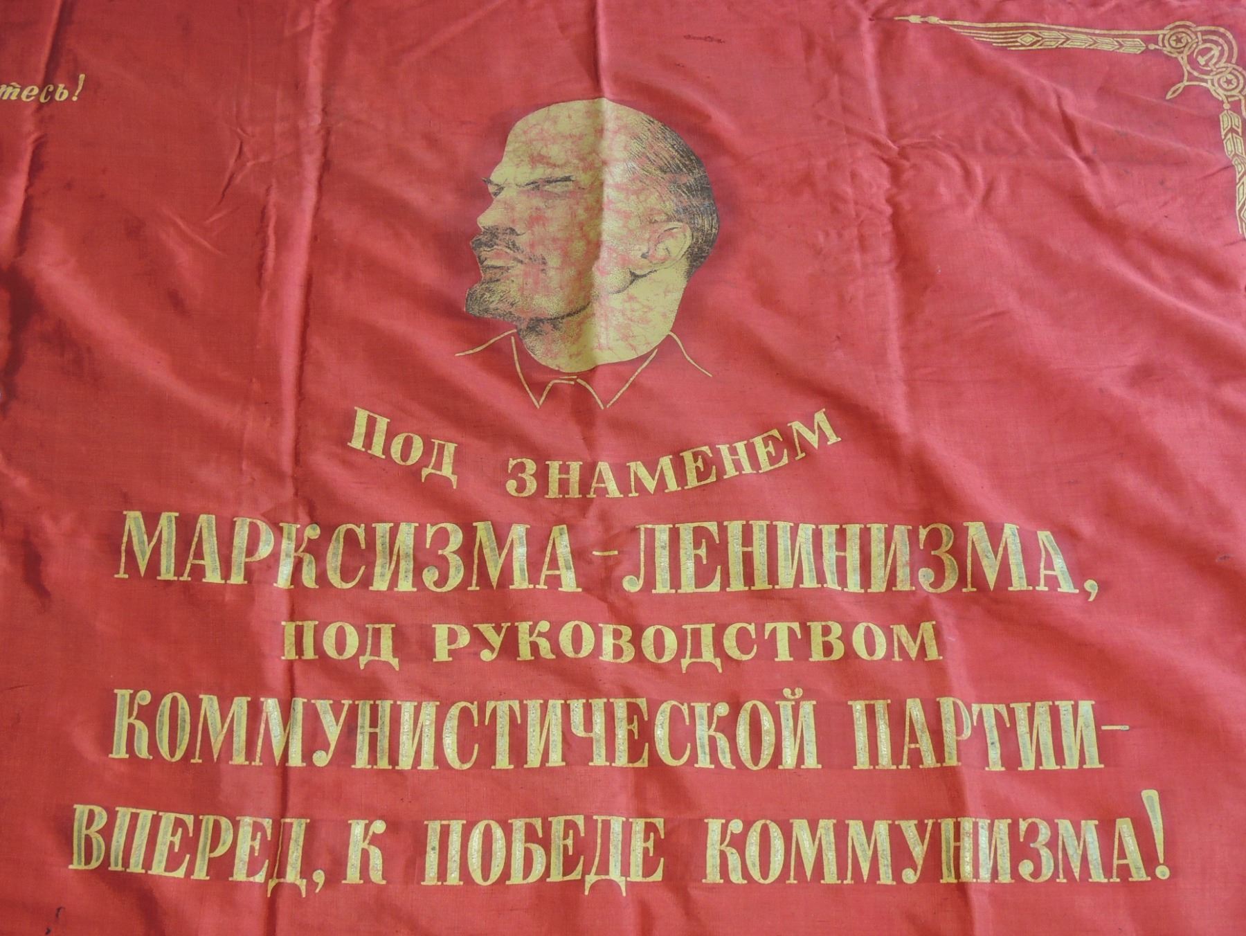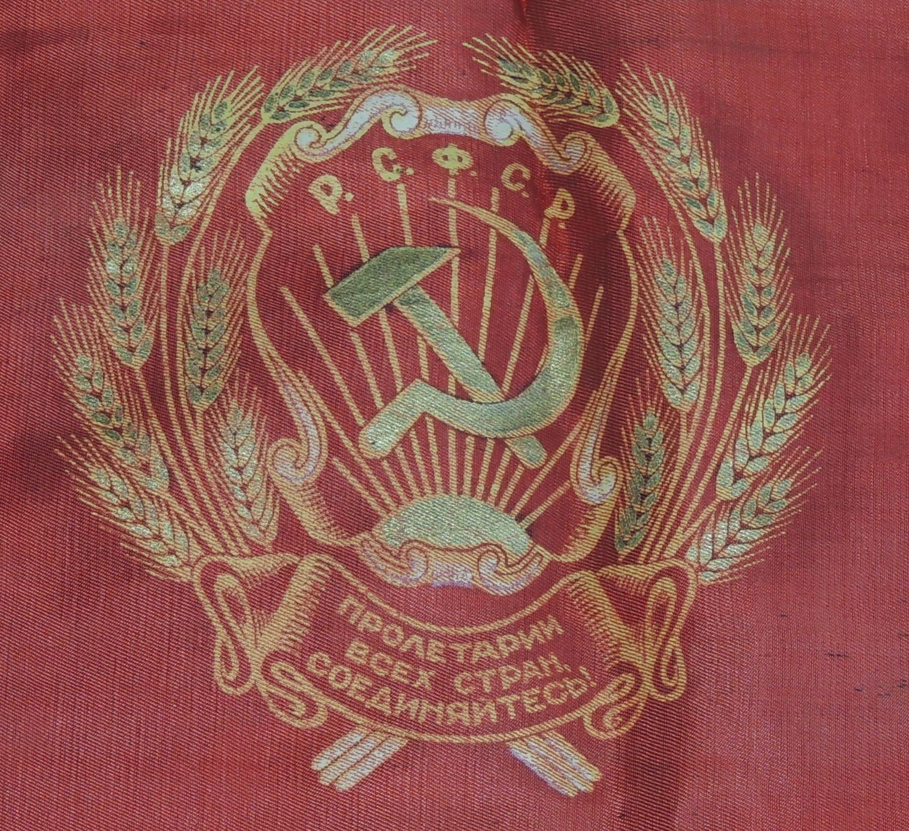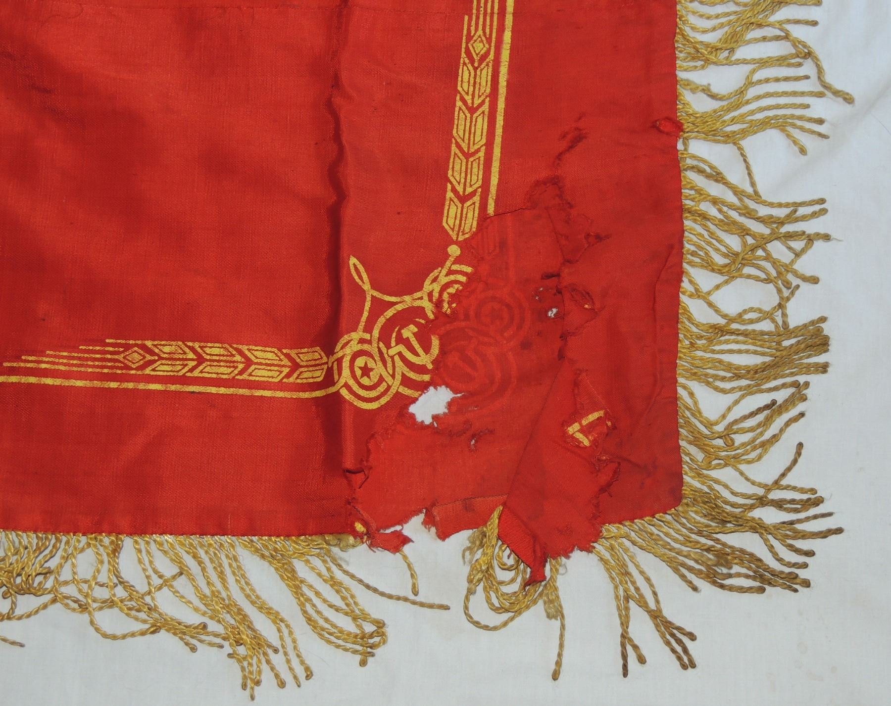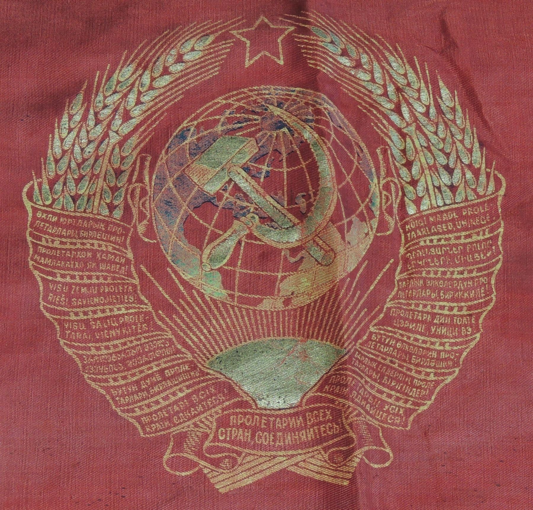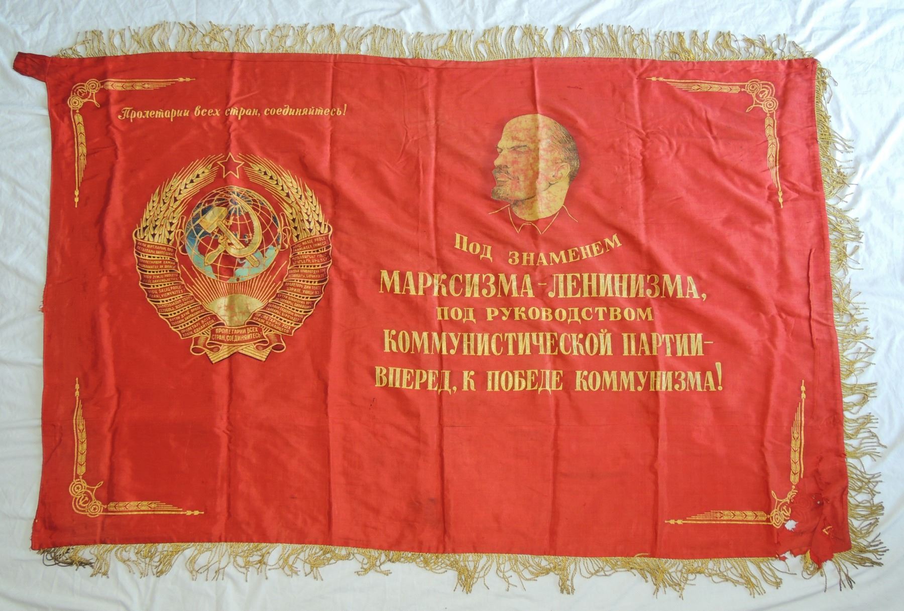 66X44 INCHES IN SIZE LARGE BANNER DOUBLE SIDED WITH SOVIET STATES HAS WEAR COLD WAR ERA COMMUNIST RUSSIAN FLAG