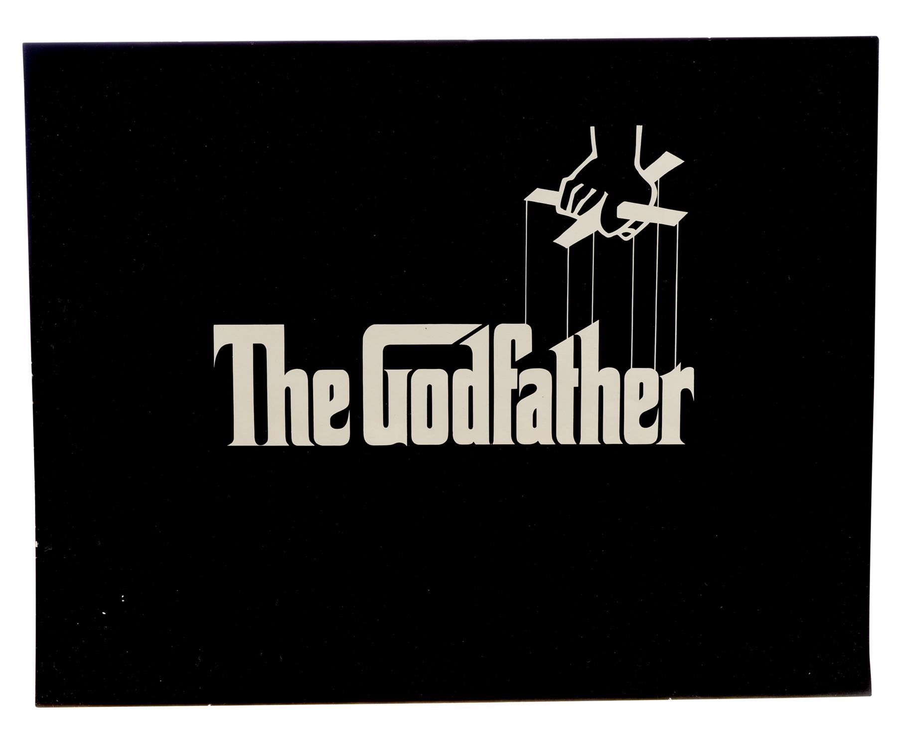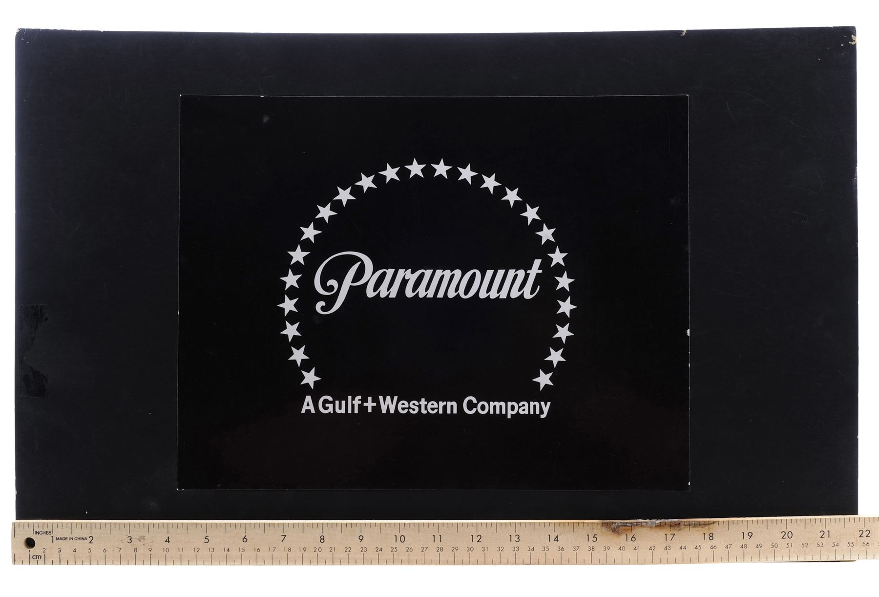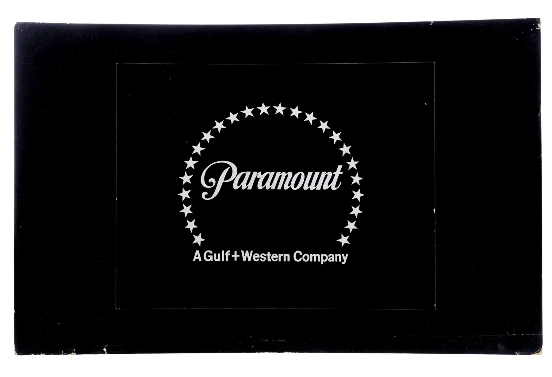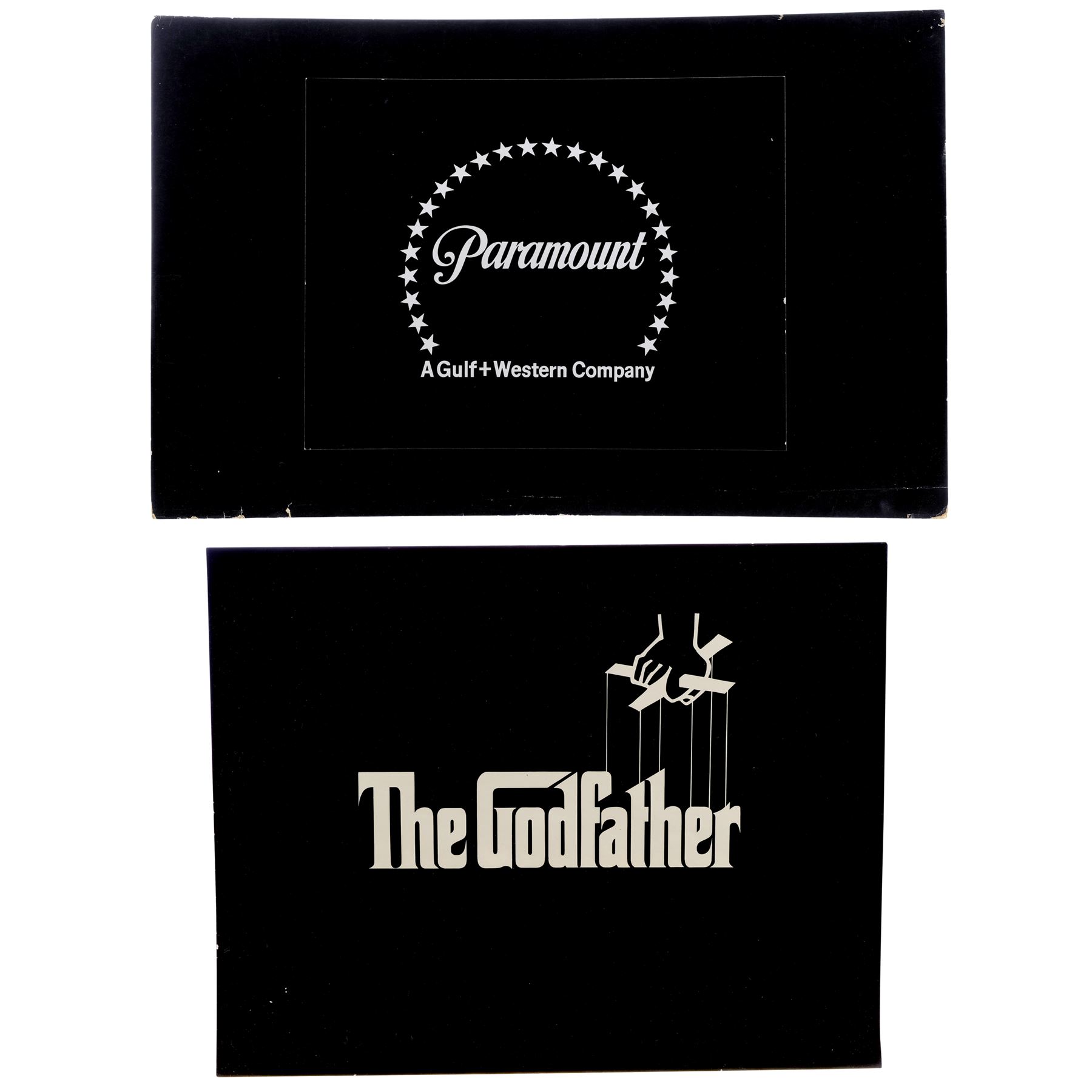 Originally obtained from Pacific Title and Art Studio in the early 1980s, this lot consists of two coated cardstock paper cards. The Paramount card features the printed logo and thicker typeface where curlicues are pronounced, and is mounted on a black cardstock. The Godfather card features an off-white printed logo on a black background. The cards exhibit tears, scuffing, edge wear, creasing, and residual tape residue. Dimensions: 22" x 14" x 0.25" (56 cm x 35.5 cm x 0.75 cm)