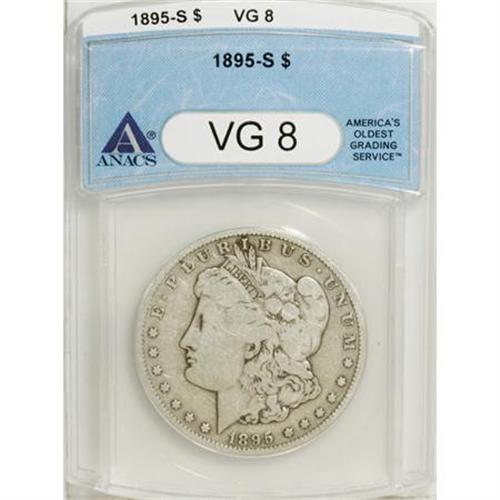 <!-- BEGIN: ICOLLECTOR - EBAY LOT HTML CODE --><style type='text/css'> #icoll_images_thumbnails, #icoll_images_mainimage, #icoll_otherlots { display: none; } div { font-family: arial, verdana, helvetica; } img { border: none; } .icoll_heading_title { background-color: #EFEFFF; color: #000; font-family: arial, verdana, helvetica; font-size: 12pt; font-style: normal; font-weight: bold; } </style><style type='text/css'>@import url(http://www.icollector.com/css/ebay/ebaylot_20070703.css);</style><script language='javascript' type='text/javascript'>function icollfunc_getelement(element_id) { var tmpelement = null; if(document.getElementById) tmpelement = document.getElementById(element_id); if(tmpelement == null) tmpelement = document[element_id]; return tmpelement; }var icollvar_mainpic = null; function icollfunc_initimages() { icollfunc_getelement('mainPicture').style.display = 'none'; icollvar_mainpic = icollfunc_getelement('icoll_images_mainimage'); var body_onload = document.body.attributes['onload']; document.body.setAttribute('onload', (body_onload ? body_onload.nodeValue : '') + 'icollfunc_fixoperaimgbug();'); }function icollfunc_changeimage(imgurl) { if(icollvar_mainpic != null) icollvar_mainpic.src = imgurl; }function icollfunc_fixoperaimgbug() { if(window.opera) { var imgobjs = icollfunc_getelement('icoll_images_thumbnails').getElementsByTagName('img'); for(var i=0; i<imgobjs.length; i++) { var w = imgobjs[i].clientWidth; if(w > 0) imgobjs[i].style.width = w + 'px'; } } }</script><script language='javascript' type='text/javascript'> var useragent = escape(navigator.userAgent); var appname = escape(navigator.appName); var dateobj = new Date(); var datetime = escape(dateobj.getFullYear()+'-'+(dateobj.getMonth()+1)+'-'+dateobj.getDate()+' '+dateobj.getHours()+':'+dateobj.getMinutes()); var referrer = ''; if(document.referrer && document.referrer != null) referrer = escape(document.referrer); new Image().src = 'http://www.icollector.com/stats/ebaylot.ashx?id=7140295&ua='+useragent+'&an='+appname+'&dt='+datetime+'&tz='+dateobj.getTimezoneOffset()+'&re='+referrer;</script><div id='icoll_images'><div id='icoll_images_prev'><a href='http://cgi.liveauctions.ebay.com/ws/eBayISAPI.dll?ViewItem&item=170135781028'><img src='http://www.ha.com/common/proxyImage.php?ebay=445-86002-1-75' alt='' /><img src='http://icollector.com/graphics/ebay_leftarrow.gif' alt='' class='arrow' /></a><div id='icoll_images_prev_info'>Prev Lot</div></div><div id='icoll_images_next'><a href='http://cgi.liveauctions.ebay.com/ws/eBayISAPI.dll?ViewItem&item=170135781048'><img src='http://www.ha.com/common/proxyImage.php?ebay=445-19005-1-75' alt='' /><img src='http://icollector.com/graphics/ebay_rightarrow.gif' alt='' class='arrow' /></a><div id='icoll_images_next_info'>Next Lot</div></div><div id='icoll_images_thumbnails'><a href='http://www.ha.com/common/proxyImage.php?ebay=445-121068-1-75' target='_blank' onmouseover="icollfunc_changeimage('http://www.ha.com/common/proxyImage.php?ebay=445-121068-1-75');"><img src='http://www.ha.com/common/proxyImage.php?ebay=445-121068-1-75' alt='' /></a><a href='http://www.ha.com/common/proxyImage.php?ebay=445-121068-2-75' target='_blank' onmouseover="icollfunc_changeimage('http://www.ha.com/common/proxyImage.php?ebay=445-121068-2-75');"><img src='http://www.ha.com/common/proxyImage.php?ebay=445-121068-2-75' alt='' /></a><div id='icoll_images_thumbnails_info'>Hover thumbnail to view large image below. Click thumbnail to view full image in new window.</div></div><div id='icoll_images_mainimage_container'><img id='icoll_images_mainimage' alt='' src='http://www.ha.com/common/proxyImage.php?ebay=445-121068-1-75'></div></div><script language='javascript' type='text/javascript'>icollfunc_initimages();</script><div id='icoll_description'><B>1895-S $1 VG8 ANACS.</B></I> NGC Census: (23/1078). PCGS Population (35/1716). Mintage: 400,000. Numismedia Wsl. Price for NGC/PCGS coin in VG8 : $350. (#7238)<BR><BR><B>Coin Engraver:</B> George T. Morgan<BR><BR><b>Shipping:</b> Coins & Currency (<a target="_blank" href="http://www.heritageauctions.com/common/shipping.php">view shipping information</a>\)</div><div id='icoll_notices'><div class='icoll_heading_left'></div><div class='icoll_heading'><div class='icoll_heading_title'>Notices</div></div><div class='icoll_heading_right'></div><div id='icoll_notices_info'><B>Important notice:</B> Heritage usually auctions material at the rate of 200-250 lots per hour. On some occasions eBay Live bid software or the Internet may not be able to keep up with the pace of the auction. We recommend placing a realistic absentee bid now as insurance to avoid disappointment. Occasionally the auctioneer may eliminate or reject an eBay Live bid, and the auctioneer may also reopen a lot after the close of the eBay live bidding (usually because we missed an audience bid), and may reject your bid even if it shows you as the winning bidder. By bidding via eBay Live, you agree that Heritage may award the lot to another bidder at its sole discretion under the circumstances described above or any other reasonable circumstances. Since eBay bids are not shown to us until we open the lot on the floor, we treat those bids just like floor bids. In most cases the floor responds before the eBay bid is presented to us, due to Internet lag time, so for consistency we have made it a policy that floor bids are always considered first over tie eBay live bids. Also please note that all Heritage lots purchased through eBay Live carry a 20% Buyer's Premium with a $9 minimum Buyer's Premium. Please make sure you read the Terms and Conditions before you bid. This lot is being auctioned in conjunction with a live floor auction by Heritage Auctions. All final auction and invoice information will be supplied by Heritage Auctions, and all other information should be considered preliminary. <BR><BR><B>Winning Notification and Billing:</B> After the FINAL session in this auction is complete, Heritage wi