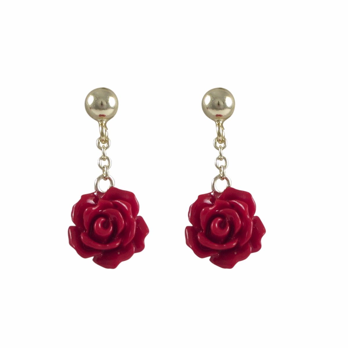 8Mm Red Rose Flower Dangling, On Gold Plated Sterling Silver Ball Post Earrings, 0.94"