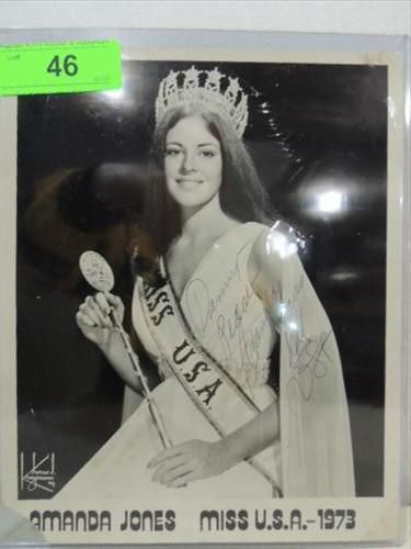 8X10 1973 MISS USA PHOTO AUTOGRAPH AMANDA JONES.  NO COA.  AS SHOWN.  VIEW PICTURE FOR DETAIL.  PLEASE BE ADVISED, AND INFORMED REGARDING SIGNATURES OR AUTOGRAPHS THAT WE SELL AT AUCTION:   WE ARE NOT AUTHENTICATORS, AND WE DO NOT AUTHENTICATE, OR VALIDATE ANY AUTOGRAPHS OR SIGNATURES THAT WE OFFER AT AUCTION.  SOME AUTOGRAPHS OR SIGNATURES MAY COME WITH AN AUTHENTICATION FROM ANY ONE OF LITERALLY HUNDREDS OF AUTHENTICATORS ACROSS THE COUNTRY, AND AROUND THE WORLD.  WE DO NOT ENDORSE ANY AUTHENTICATOR, NOR DO WE GUARANTEE THAT ANY AUTOGRAPH OR SIGNATURE IS AUTHENTIC, OR THAT IT WILL PASS AUTHENTICATION BY ANY AUTHENTICATOR.  ALL AUTOGRAPHS OR SIGNATURES ARE SOLD
