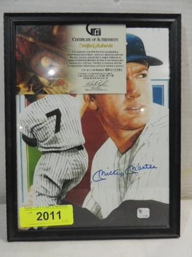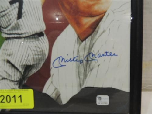 8X10 BASEBALL ILLUSTRATION AUTOGRAPH MICKEY MANTLE. INCLUDES COA FROM GAI #GV412282. AS SHOWN. VIEW PICTURE FOR DETAIL.