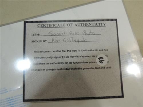 8X10 BASEBALL PHOTO AUTOGRAPHED KEN GRIFFEY JR COA. INCLUDES COA FROM XXXXXX. AS SHOWN. VIEW PICTURE FOR DETAIL. PLEASE BE ADVISED, AND INFORMED REGARDING SIGNATURES OR AUTOGRAPHS THAT WE SELL AT AUCTION: WE ARE NOT AUTHENTICATORS, AND WE DO NOT AUTHENTICATE, OR VALIDATE ANY AUTOGRAPHS OR SIGNATURES THAT WE OFFER AT AUCTION. SOME AUTOGRAPHS OR SIGNATURES MAY COME WITH AN AUTHENTICATION FROM ANY ONE OF LITERALLY HUNDREDS OF AUTHENTICATORS ACROSS THE COUNTRY, AND AROUND THE WORLD. WE DO NOT ENDORSE ANY AUTHENTICATOR, NOR DO WE GUARANTEE THAT ANY AUTOGRAPH OR SIGNATURE IS AUTHENTIC, OR THAT IT WILL PASS AUTHENTICATION BY ANY AUTHENTICATOR. ALL AUTOGRAPHS OR SIGNATURES ARE SOLD