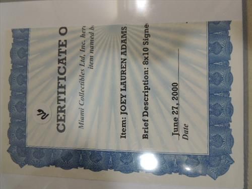 8X10 MOVIE STAR PHOT AUTOGRAPHED JOEY LAUREN ADAMS. INCLUDES COA FROM MIAMI COLLECTIBLES LTD. AS SHOWN. VIEW PICTURE FOR DETAIL. PLEASE BE ADVISED, AND INFORMED REGARDING SIGNATURES OR AUTOGRAPHS THAT WE SELL AT AUCTION: WE ARE NOT AUTHENTICATORS, AND WE DO NOT AUTHENTICATE, OR VALIDATE ANY AUTOGRAPHS OR SIGNATURES THAT WE OFFER AT AUCTION. SOME AUTOGRAPHS OR SIGNATURES MAY COME WITH AN AUTHENTICATION FROM ANY ONE OF LITERALLY HUNDREDS OF AUTHENTICATORS ACROSS THE COUNTRY, AND AROUND THE WORLD. WE DO NOT ENDORSE ANY AUTHENTICATOR, NOR DO WE GUARANTEE THAT ANY AUTOGRAPH OR SIGNATURE IS AUTHENTIC, OR THAT IT WILL PASS AUTHENTICATION BY ANY AUTHENTICATOR. ALL AUTOGRAPHS OR SIGNATURES ARE SOLD