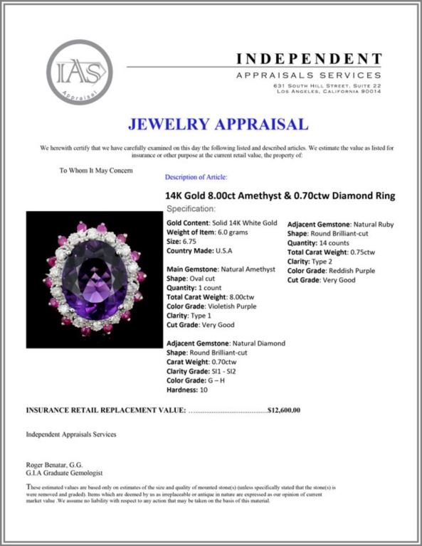 Regarding Appraised Jewelry and Loose Stones - Auctionfarm sends them out to a third party for Retail Replacement Value Appraisals, which are the most common. These types of evaluations are written for insurance needs. This would be the cost to replace the jewelry with an item of equal quality and kind, considered to be the current market price or the replacement value. This type of appraisal is done to protect you in the event of damage or loss of a valuable item. Our appraisals are conducted by independent 3rd Party appraisal firms that utilizes Certified GIA Gemologist. Appraisals should be used for verification of gemstone and/or metal weight, size, and grade only, not actual value. Appraisal value should be considered for insurance purposes only, not actual value, as price varies greatly from retail locations thru out the world. Items should not be purchased with the expectation to resell for appraisal price, or for profit.
