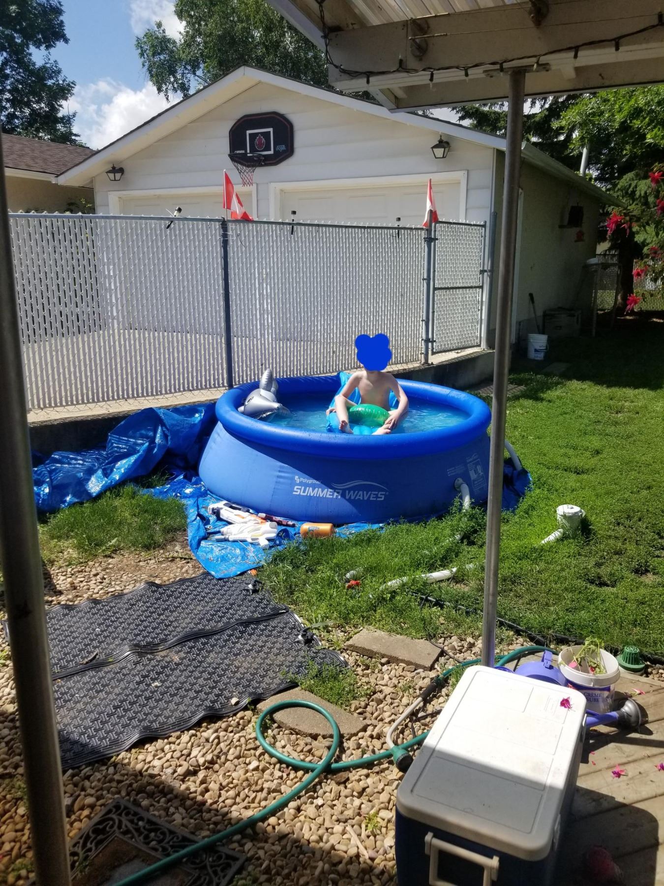 8ft Pool, comes with chemicals, heating matt, pool cover, pool vacuum garden hose style, pool skimmer, and pool filtration pump and the hockey bag its stored in, not top inflatable ring has small hole, slow leak but still holds water...used