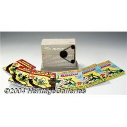 <B>8mm Movie Projector with Six Batman and Jason Serials (Columbia/DC, undated).</B></I> Long before Betamax, VHS, or DVDs, there was 8mm film. This group of items harkens back to those early days of movie viewing at home, with a vintage 8mm projector and six films: <B>Adventures of Batman</B></I> episode #2 "The Bat's Cave," episode #5 "The Executioner Strikes," episode #6 "The Doom of the Rising Sun," plus <B>Jason and the Argonauts</B></I> #1 "Battle With Talos," #3 "Hydra of Hades," and #4 "The Golden Fleece." Other than the "WM" logo on the front of the projector, there is no indication of the company that produced it, the nation of origin, or the date of manufacture. The projector requires two 1.5 volt batteries, and while the projector has not been tested for functionality, it does appear to be in working condition. Own a piece of home entertainment technology that will have you feeling nostalgic for those simpler times! 7 items <BR><BR><B>Important notice:</B> Heritage usually auctions material at the rate of 200-250 lots per hour. On some occasions eBay Live bid software or the Internet may not be able to keep up with the pace of the auction. We recommend placing a realistic absentee bid now as insurance to avoid disappointment. Occasionally the auctioneer may eliminate or reject an eBay Live bid, and the auctioneer may also reopen a lot after the close of the eBay live bidding (usually because we missed an audience bid), and may reject your bid even if it shows you as the winning bidder. By bidding via eBay Live, you agree that Heritage may award the lot to another bidder at its sole discretion under the circumstances described above or any other reasonable circumstances. Since eBay bids are not shown to us until we open the lot on the floor, we treat those bids just like floor bids. In most cases the floor responds before the eBay bid is presented to us, due to Internet lag time, so for consistency we have made it a policy that floor bids are always considered first over tie eBay live bids. Also please note that all Heritage lots purchased through eBay Live carry a 20% Buyer's Premium. Please make sure you read the Terms and Conditions before you bid.
