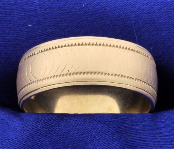 Beautiful 14k yellow gold 8mm band with satin finish with groove along each edge. Very good condition. Size 10 7.0g