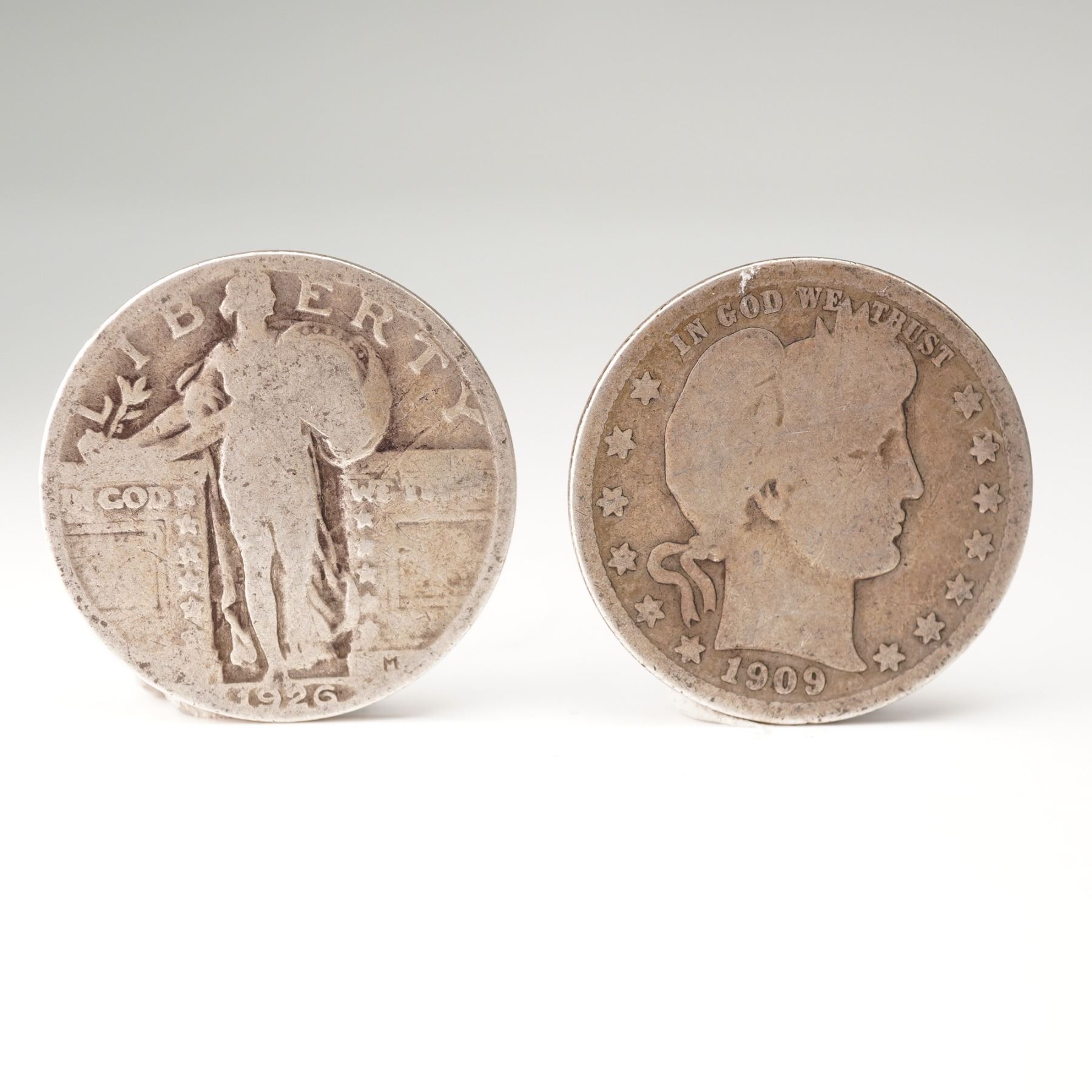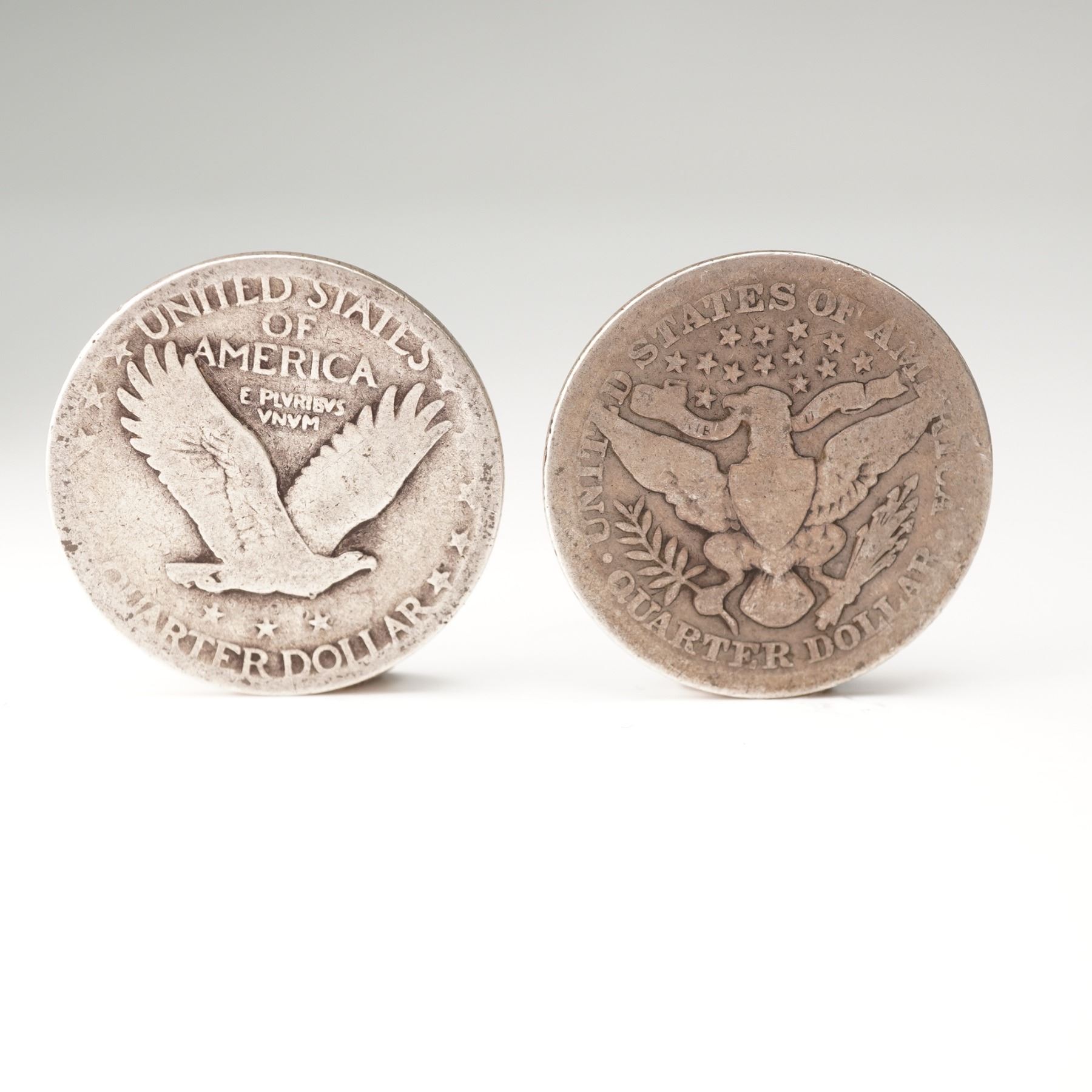 The Barber Quarter features the profile of Liberty with a laurel wreath on the obverse and an eagle with outstretched wings on the reverse. The Standing Liberty Quarters display Liberty holding a shield and olive branch on the obverse and a flying eagle on the reverse, with inscriptions reading "UNITED STATES OF AMERICA," "E PLURIBUS UNUM," and "QUARTER DOLLAR."