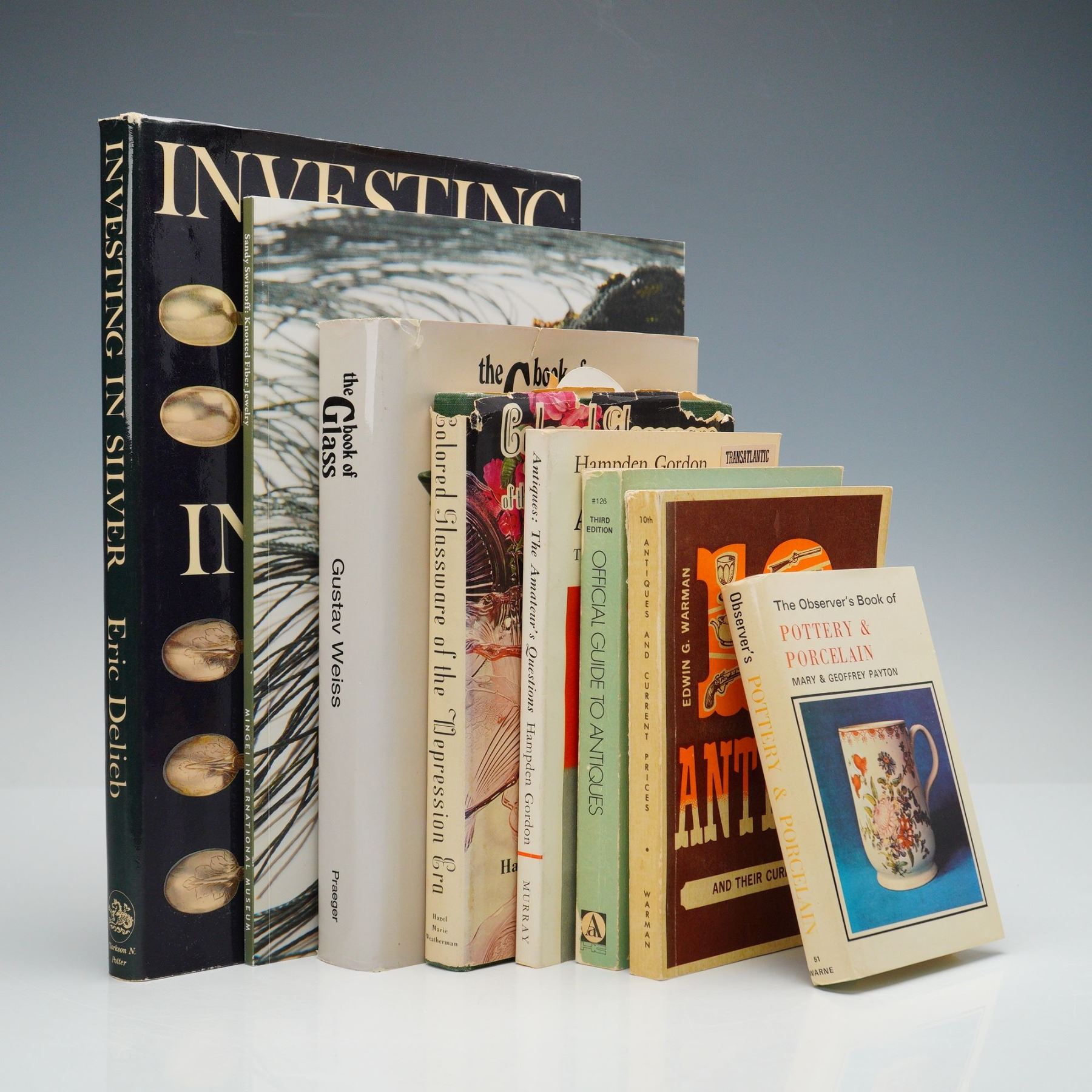 A fine assortment of eight mid-to-late 20th century reference books on antiques, decorative arts, and collecting, offering a comprehensive overview across materials and media. Titles include The Observer's Book of Pottery & Porcelain by Mary & Geoffrey Payton; Official Guide to Antiques; Antiques: The Amateur's Questions by Hampden Gordon; Colored Glassware of the Depression Era; The Book of Glass by Gustav Weiss; Investing in Silver by Eric Delieb; and others covering British ceramics, clocks, and general antiques study. Subjects range from 19th-century timepieces and pottery identification to silver investment and glassware typologies. Several volumes are illustrated throughout, including black-and-white reference plates and vivid color sections depicting ceramics and decorative arts. An ideal lot for the collector, appraiser, or student of decorative arts seeking authoritative mid-century texts and visual guides on collecting and connoisseurship. Dimensions of the collection: 8.5"W x 12"H x 4:D.