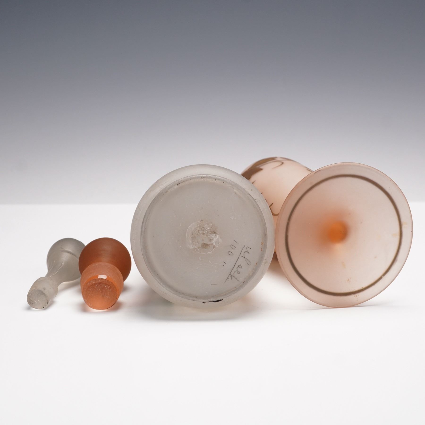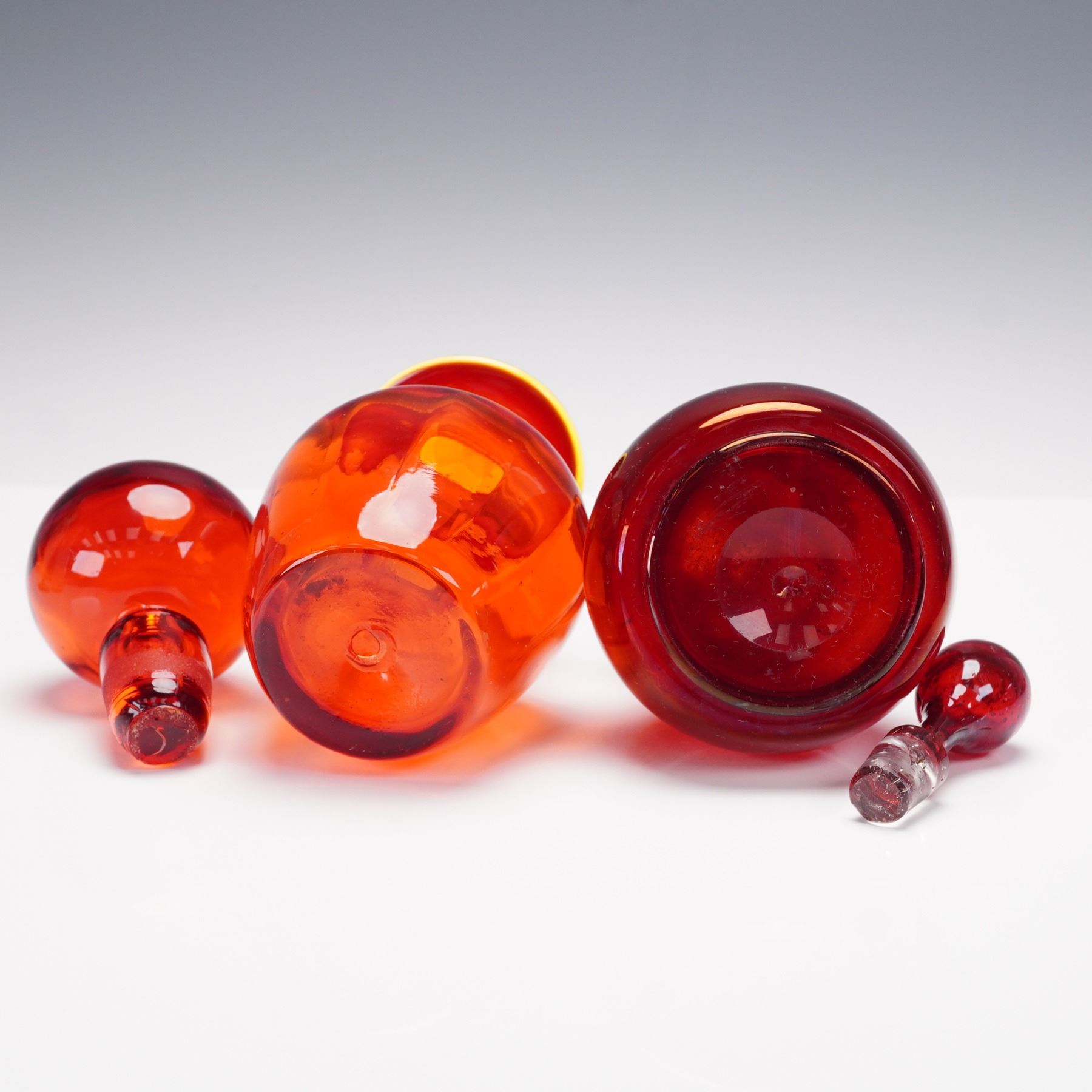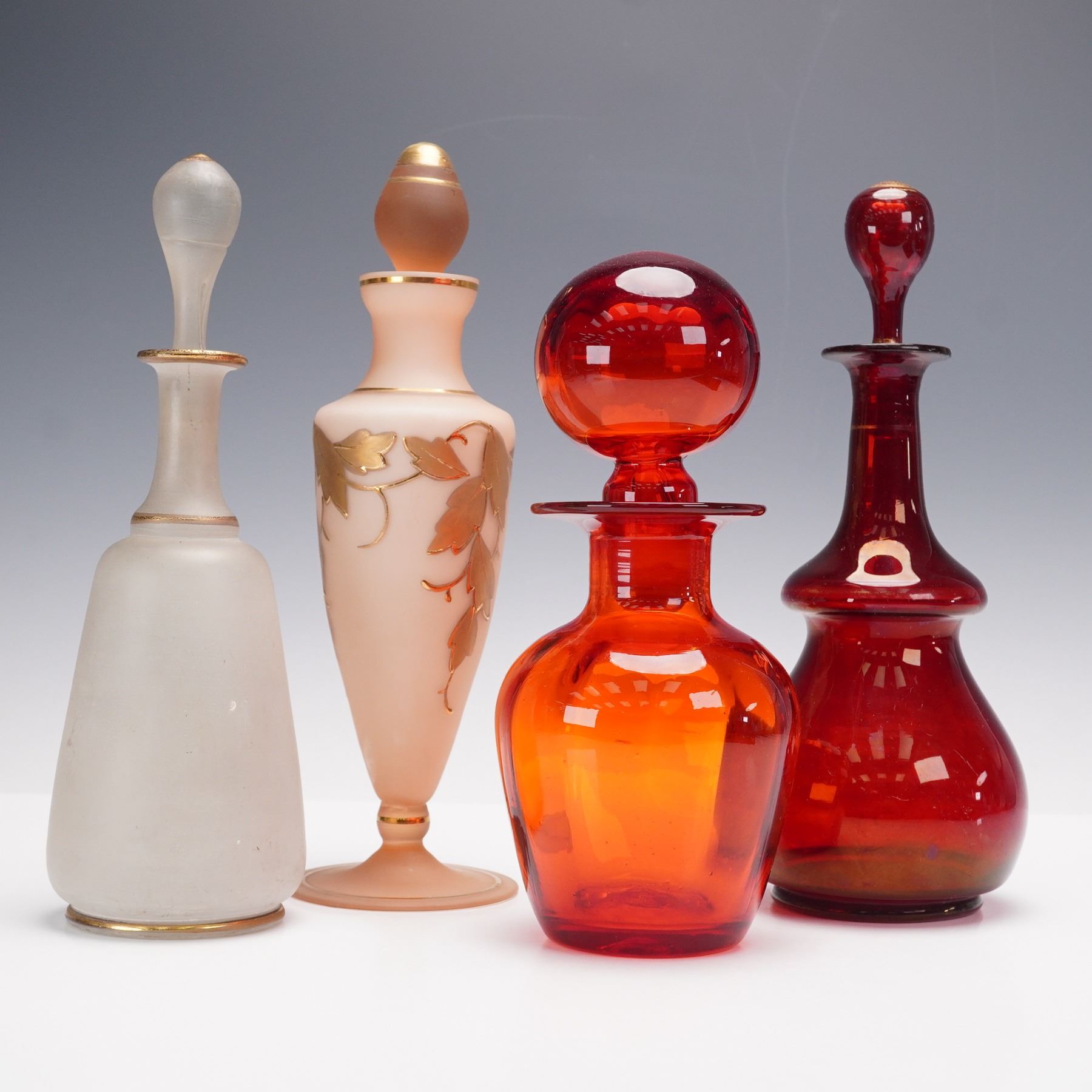 An assorted grouping of four glass decanters with matching stoppers, totaling eight pieces. The selection includes a frosted glass decanter decorated with hand painted floral enamels, a peach frosted example with gilt leaf decoration, and two richly hued decanters in shades of ruby and orange glass. Each features a fitted stopper, varying from faceted to rounded forms. A colorful and decorative set ideal for display or use in a barware collection.