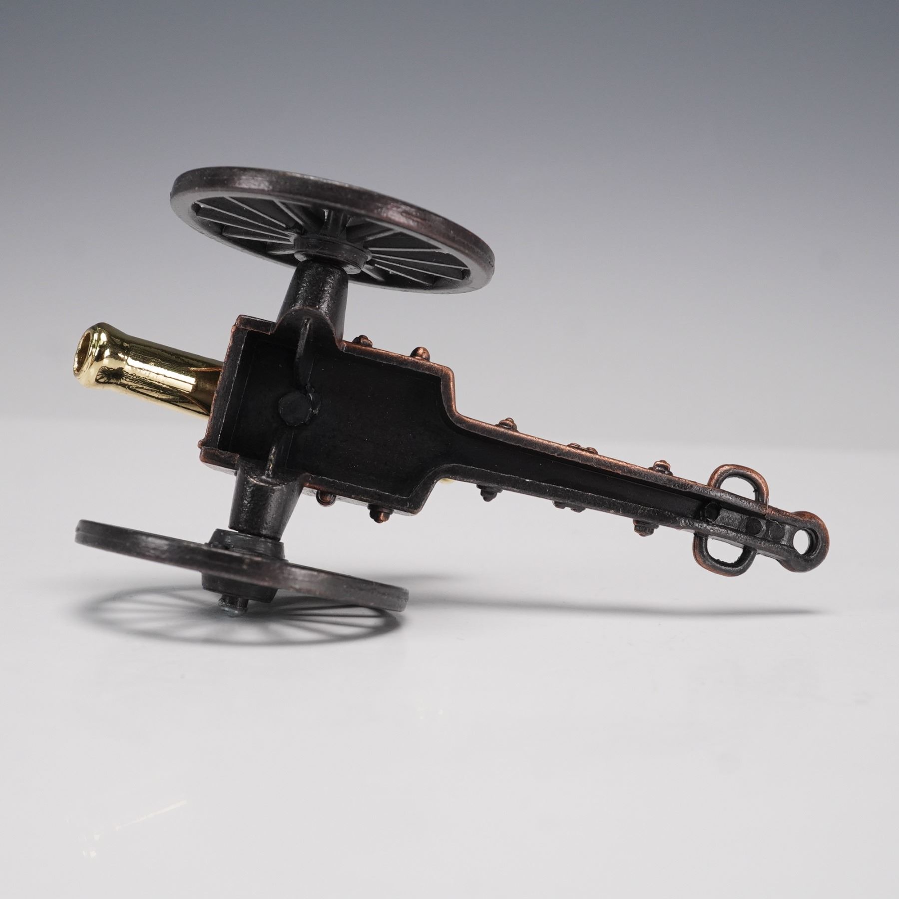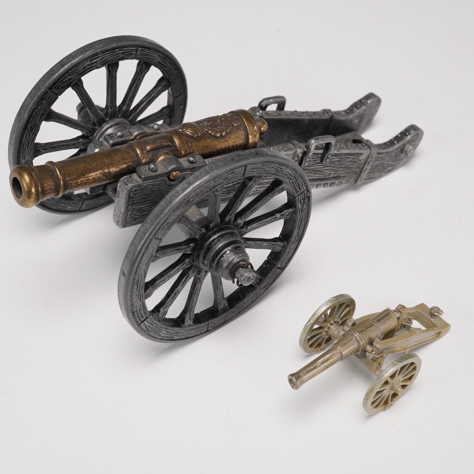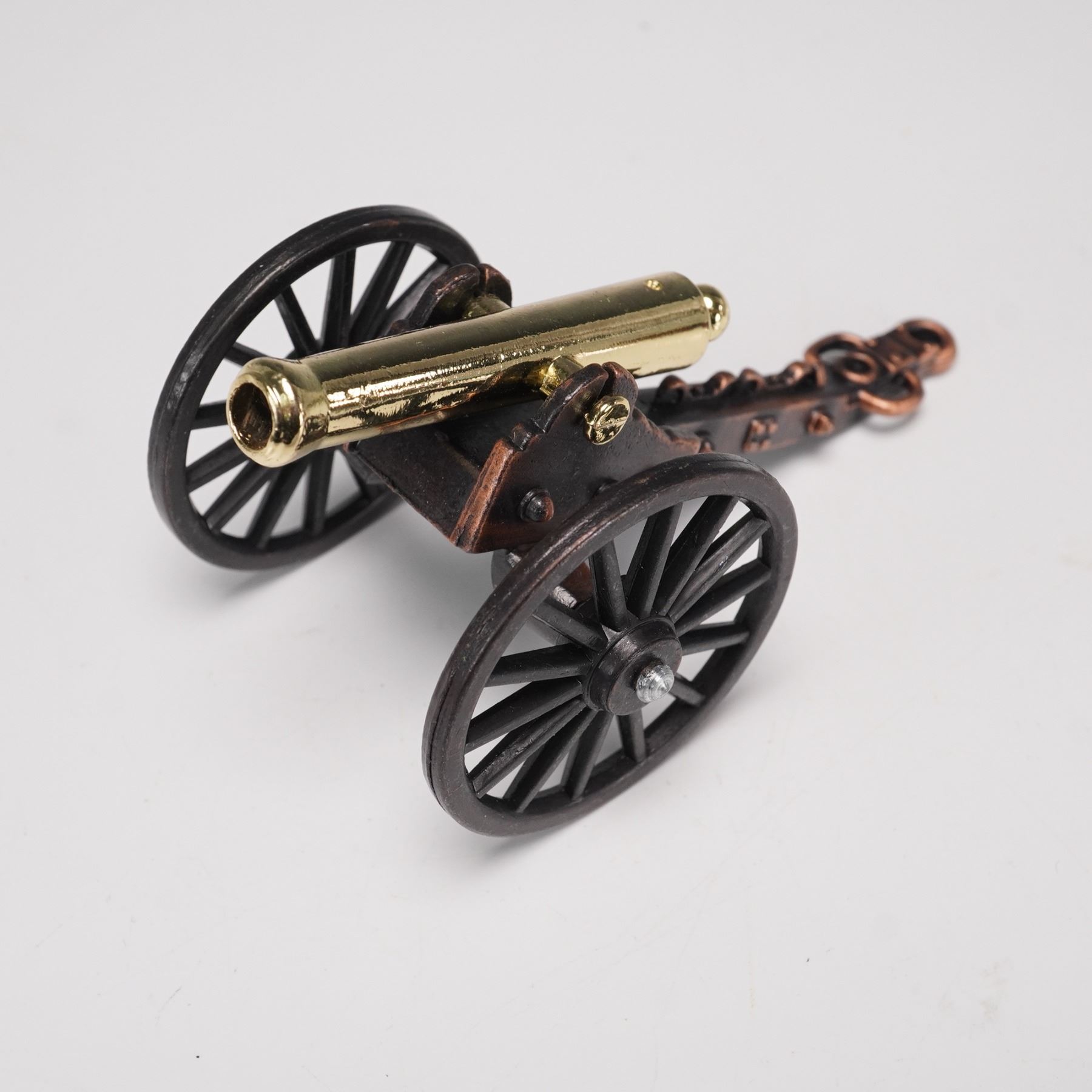 Eight-piece grouping of miniature cannons in various styles, sizes, and materials. Includes die-cast field artillery models in the style of Parrott or Civil War cannons with black spoked wheels and metallic gold barrels, along with larger decorative cannons including one in an ornate antiqued black finish with bronze-style barrel. A diverse and visually engaging set ideal for display with historical figurines or as standalone military collectibles.