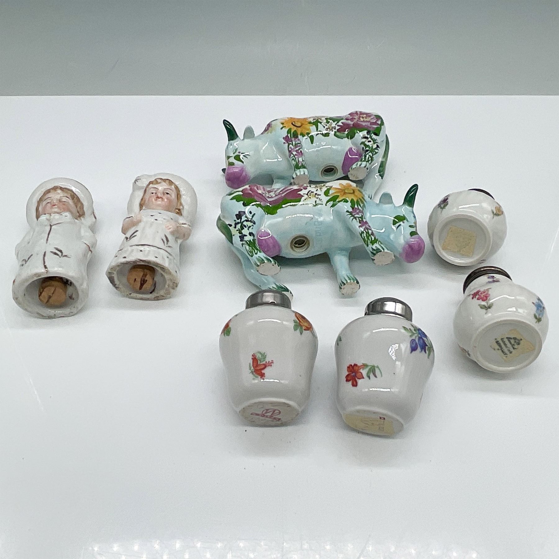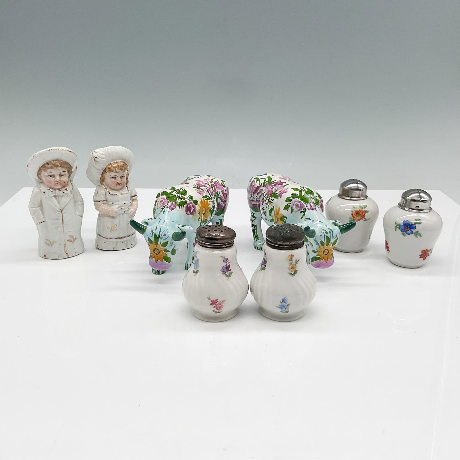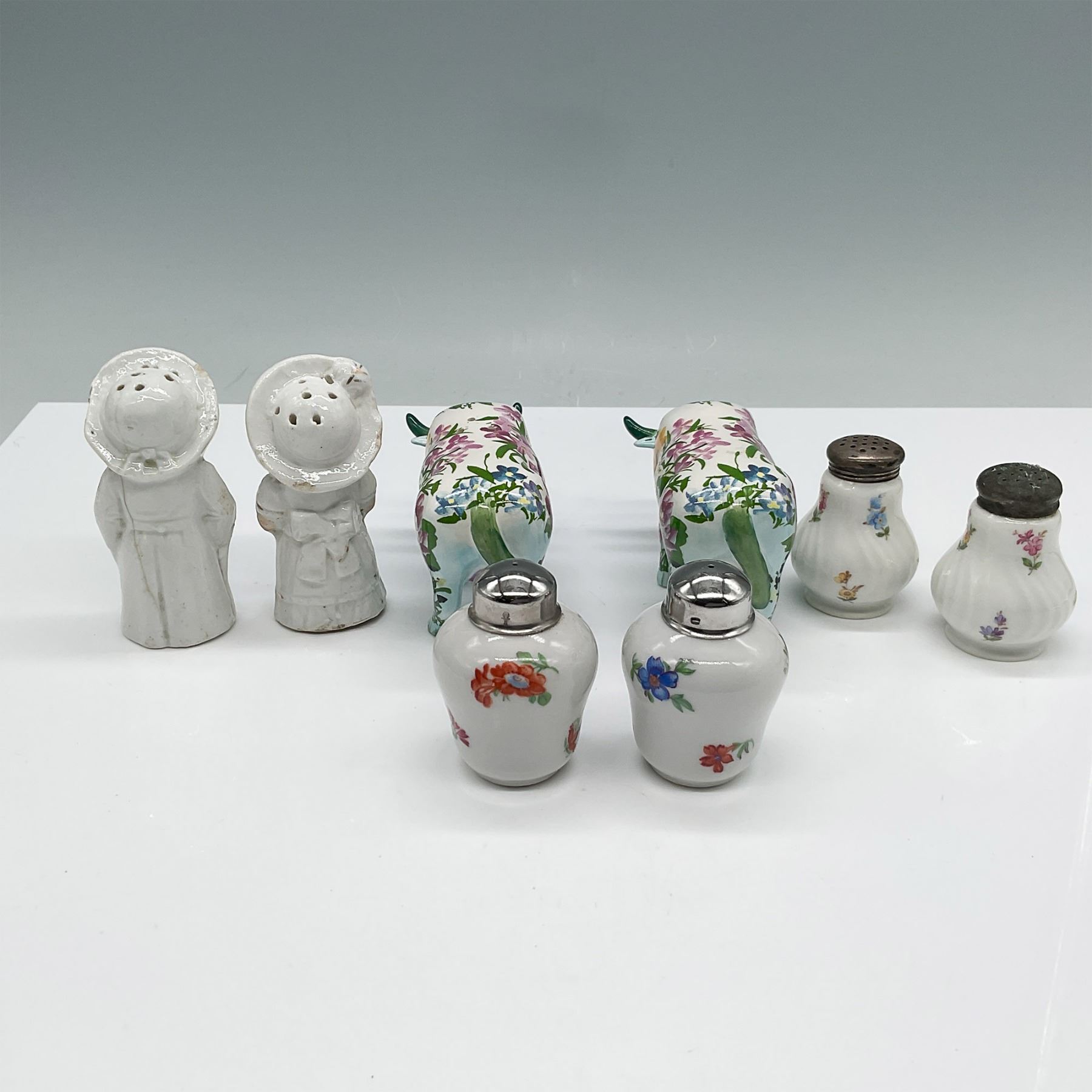 A diverse collection of vintage and decorative porcelain and ceramic salt and pepper shakers, featuring various designs and motifs. Included in this set are: A pair of Dutch boy and girl figural salt and pepper shakers (3.25"H), dressed in traditional attire with painted details. A pair of floral-patterned cow-shaped ceramic shakers (2.5"H), featuring a hand-painted design with vibrant flowers over a light blue glaze. Two pairs of porcelain salt and pepper shakers (2.5"H) with silver-tone metal lids, adorned with delicate floral decorations. Various backstamps and markings on the bases of select pieces, indicating different manufacturers.