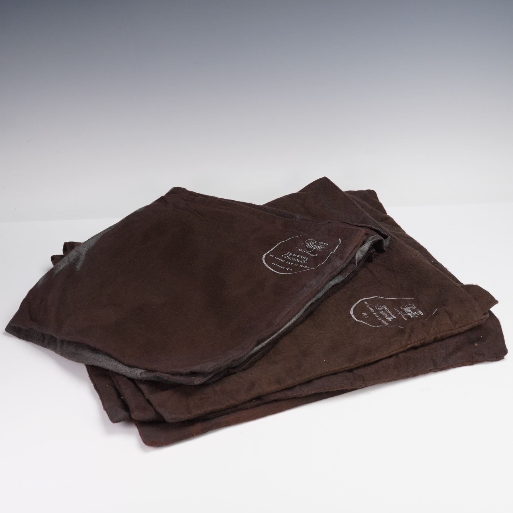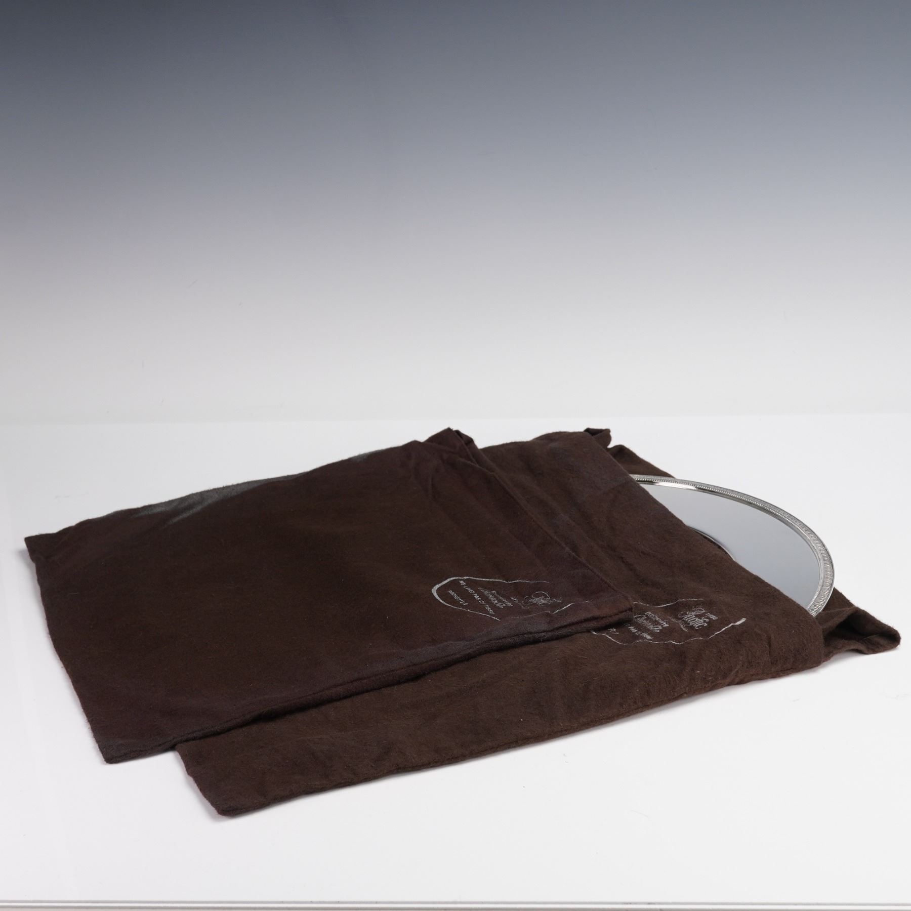 Offered is a set of eight Christofle silverplated dinner plates in the Malmaison pattern, each bearing the Christofle France Galia collection mark. This celebrated design features the neoclassical Empire-style border that has become one of Christofle's most iconic motifs. Included are eight original Christofle brown storage bags, five properly sized for the plates and three in a smaller size. The Galia marks attest to the distinguished origin and craftsmanship of this set.