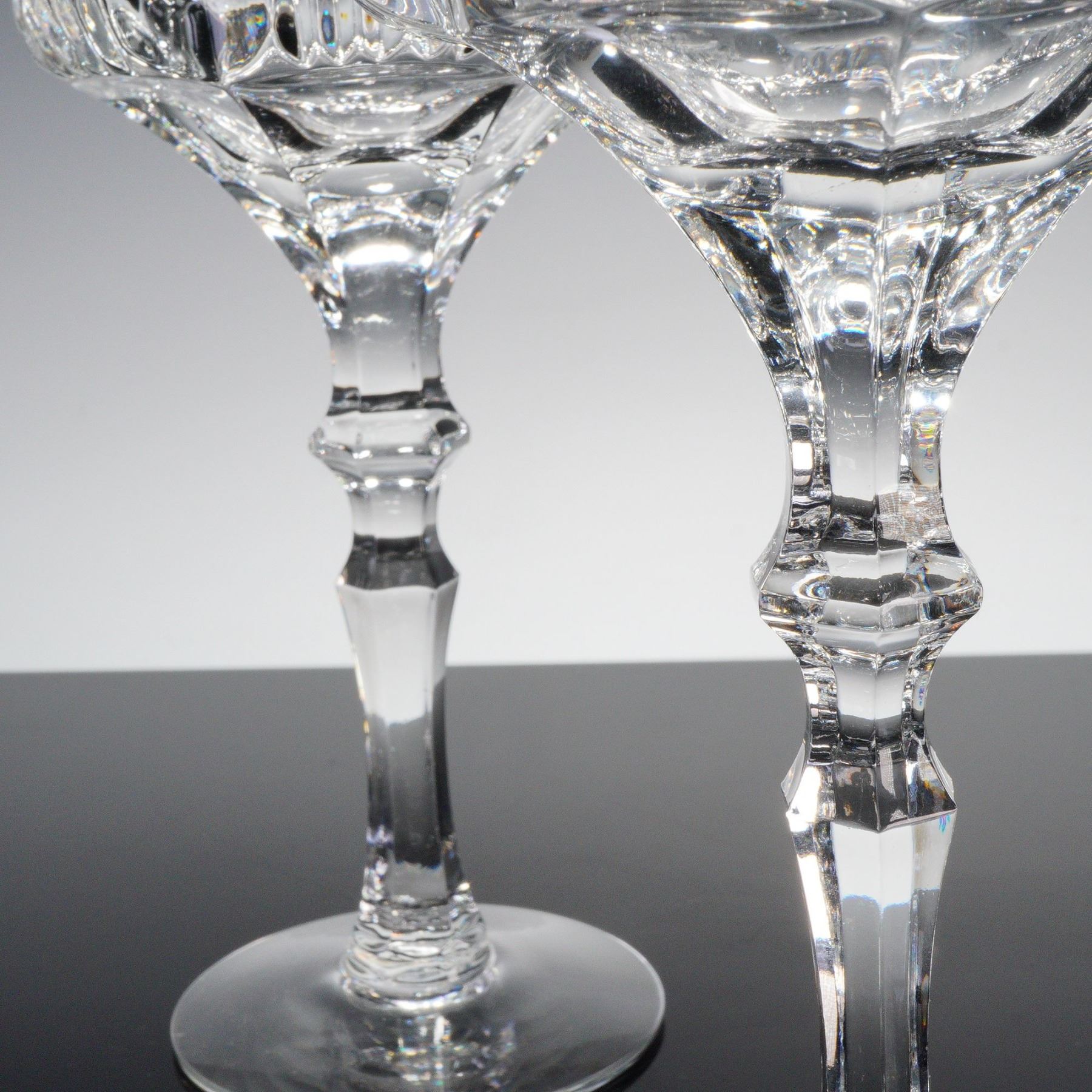 Set of clear cut crystal cocktail coupes featuring faceted stems and geometric banding with prism and panel detail. Elegant and finely crafted, ideal for champagne or cocktail service.