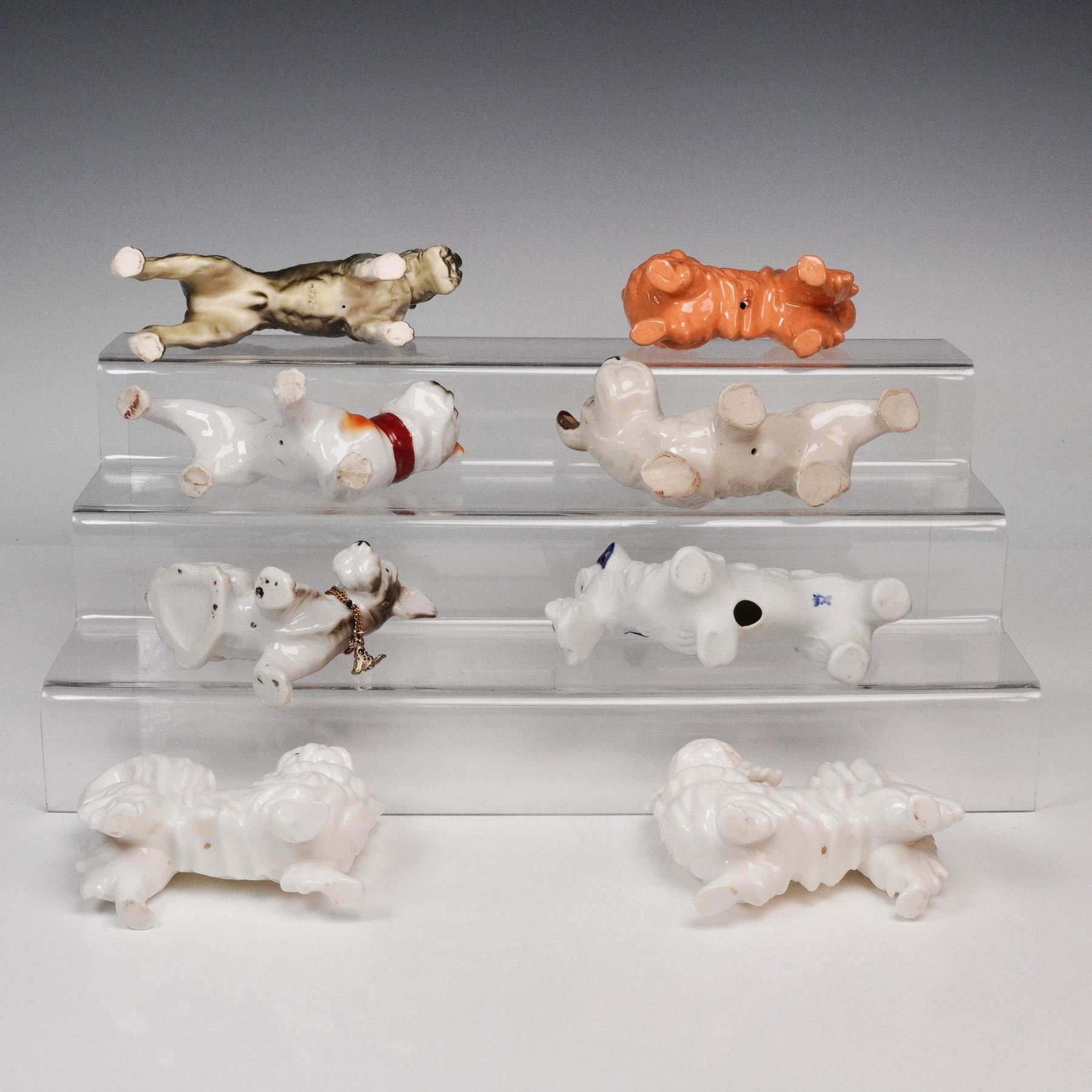 Charming collection of eight vintage porcelain dog figurines, representing a variety of breeds including a Schnauzer, Terrier, Pekingese, and Spaniel among others. The group features a mix of hand-painted Japanese imports and European-style bisque examples, some marked JAPAN and one bearing a blue crossed-sword mark. Each piece showcases delightful mid-century character and craftsmanship, from the expressive faces to the detailed fur textures and naturalistic stances. Finishes range from glossy glaze to soft matte bisque, offering a well-balanced and display-worthy assortment for collectors of vintage canine figurines.