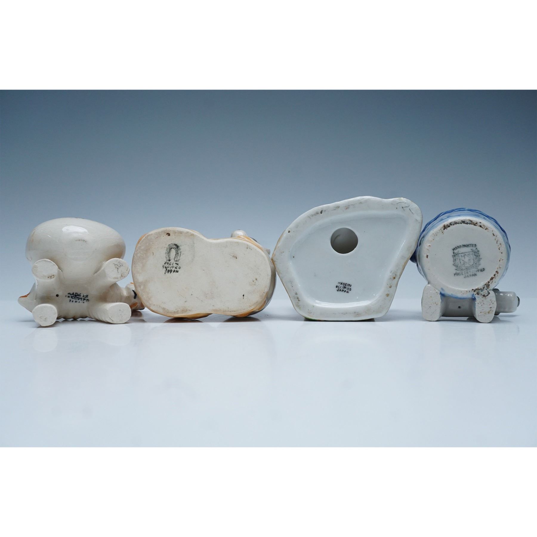A charming collection of eight vintage Japanese ceramic figural pieces, each hand-painted and marked "Made in Occupied Japan." This set includes a variety of whimsical animal-themed designs, featuring dogs, a zebra, a duck, and more. The pieces serve different functions, ranging from miniature planters and toothpick holders to an ashtray featuring a playful dog with a blue basket. Largest item measures 3.75"H.