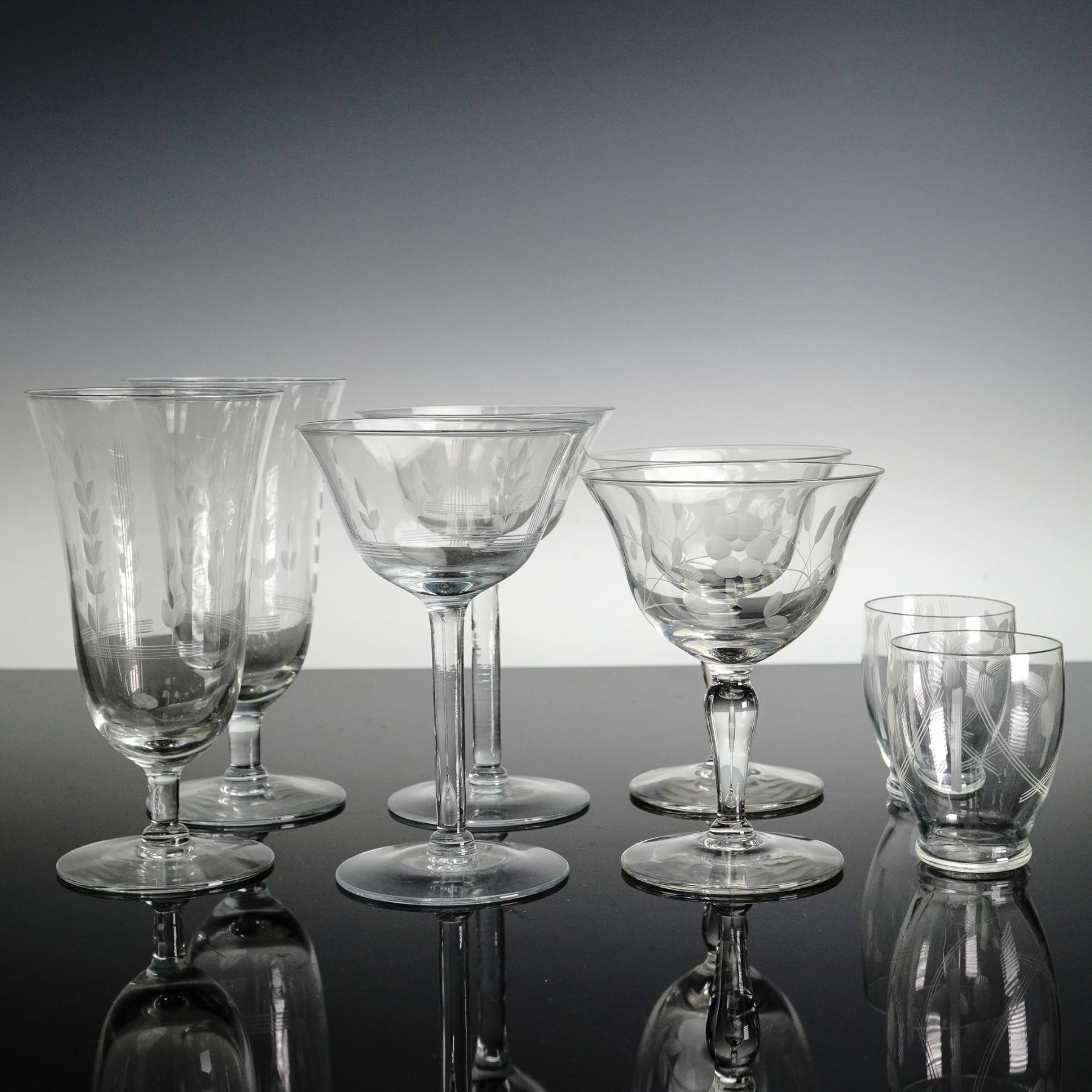 Collection of eight vintage etched glasses featuring mixed styles and patterns. The set includes two tall iced tea with vertical leaf and line etching, two coupe style cocktail glasses etched with garlands, two flared floral etched sherbet glasses, and two petite tumblers with diagonal etched foliage.