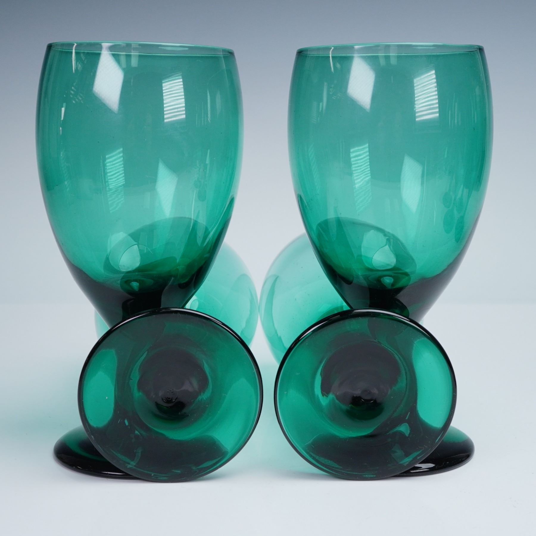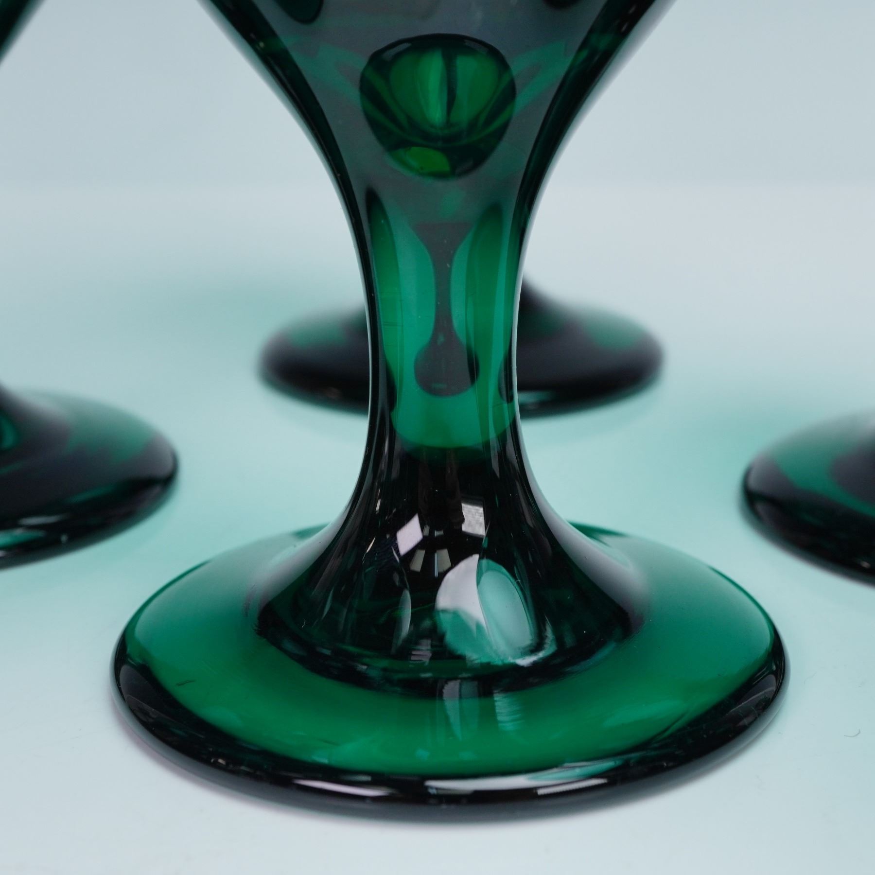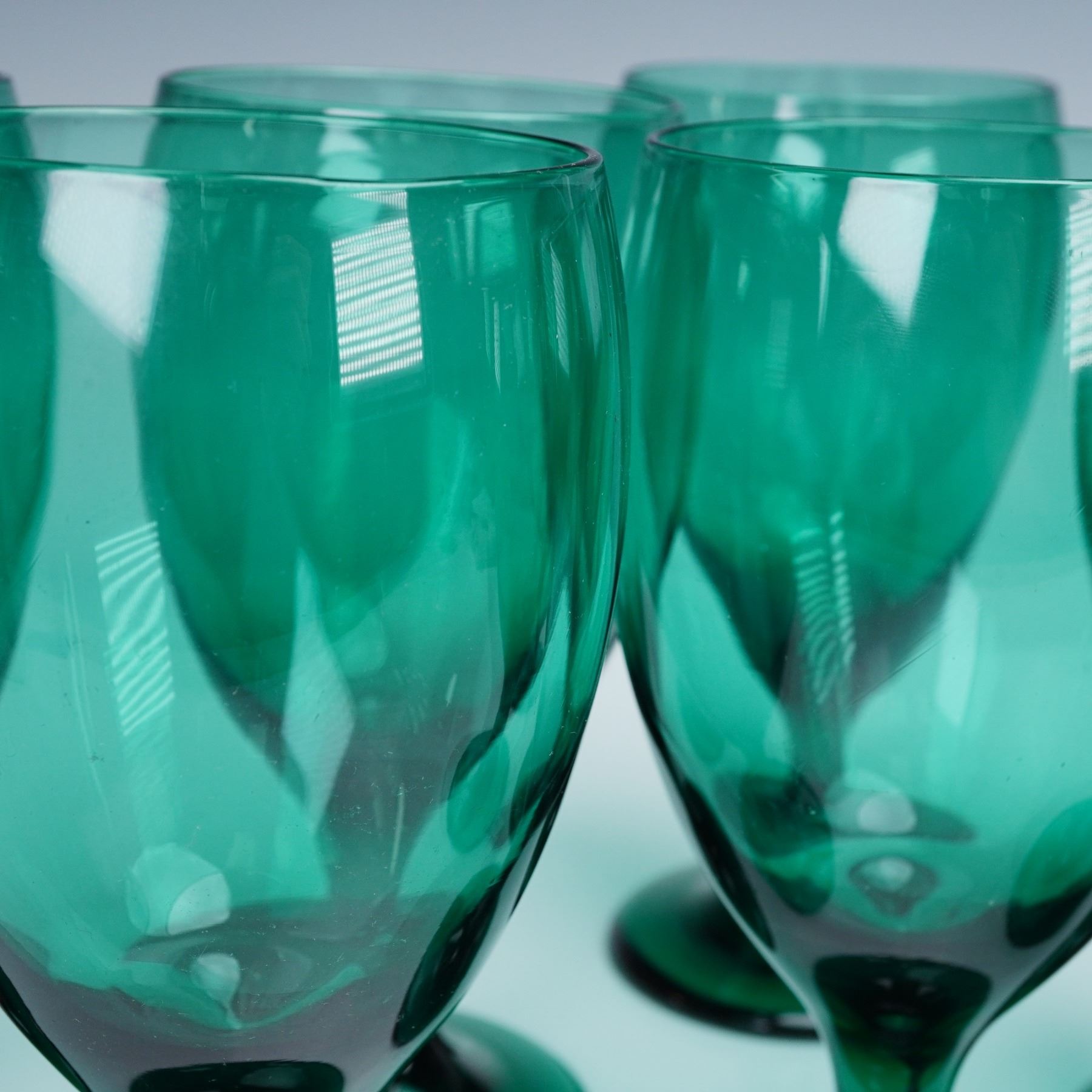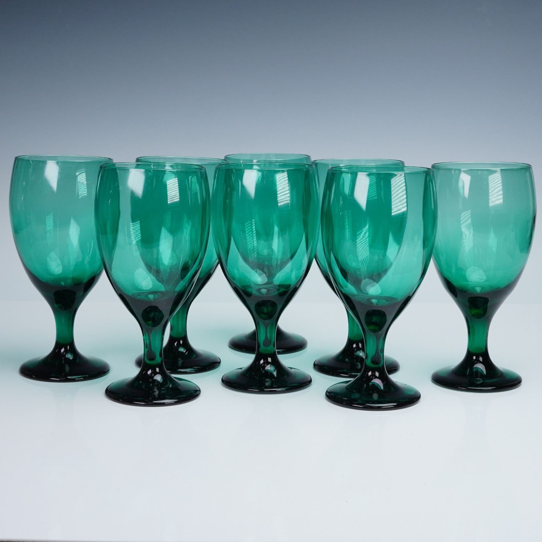Set of eight vintage Mid-Century Libbey Tear Drop wine glasses or water goblets in juniper green. Each features the signature rounded bowl and inward-pulled teardrop stem. Classic mid-century color with timeless appeal.
