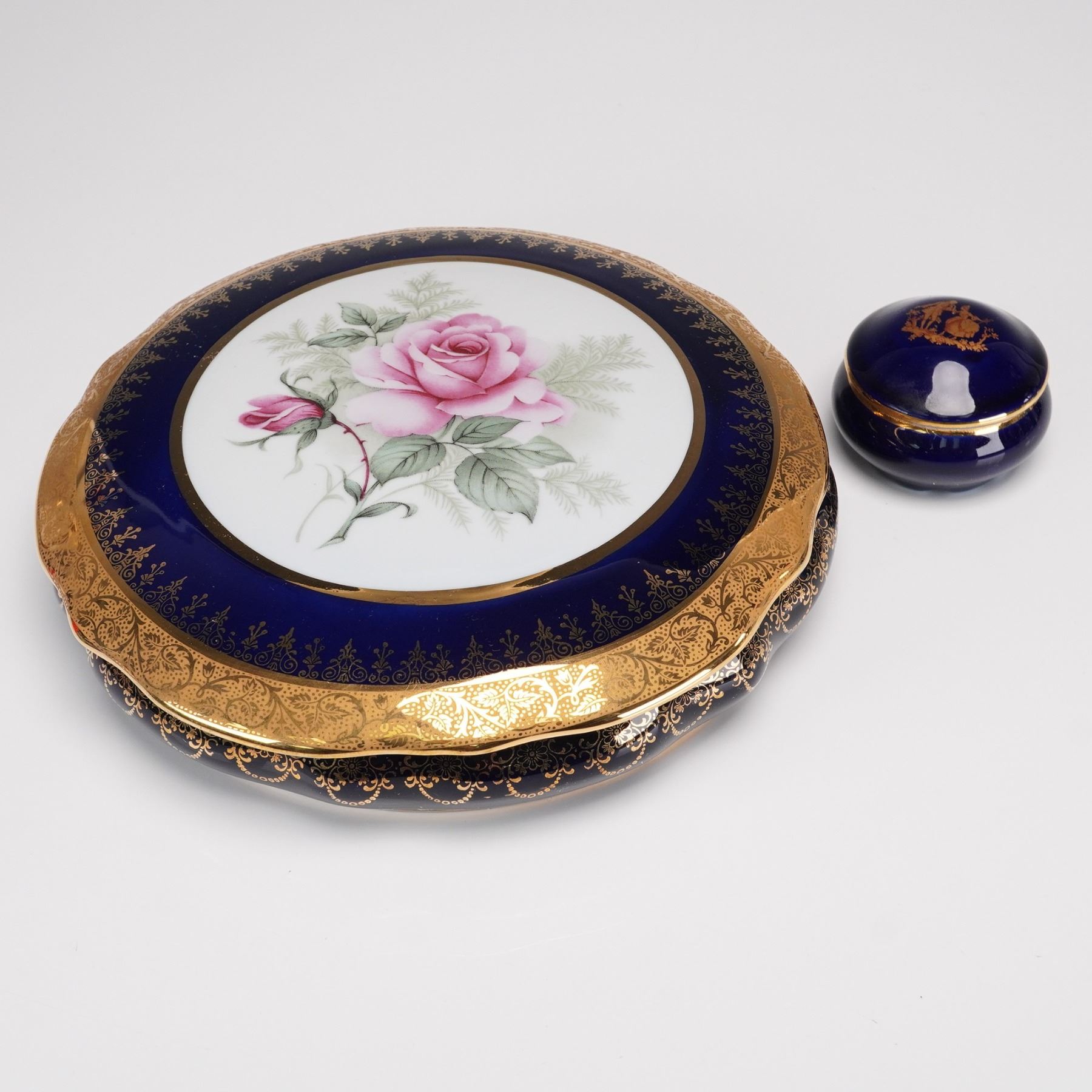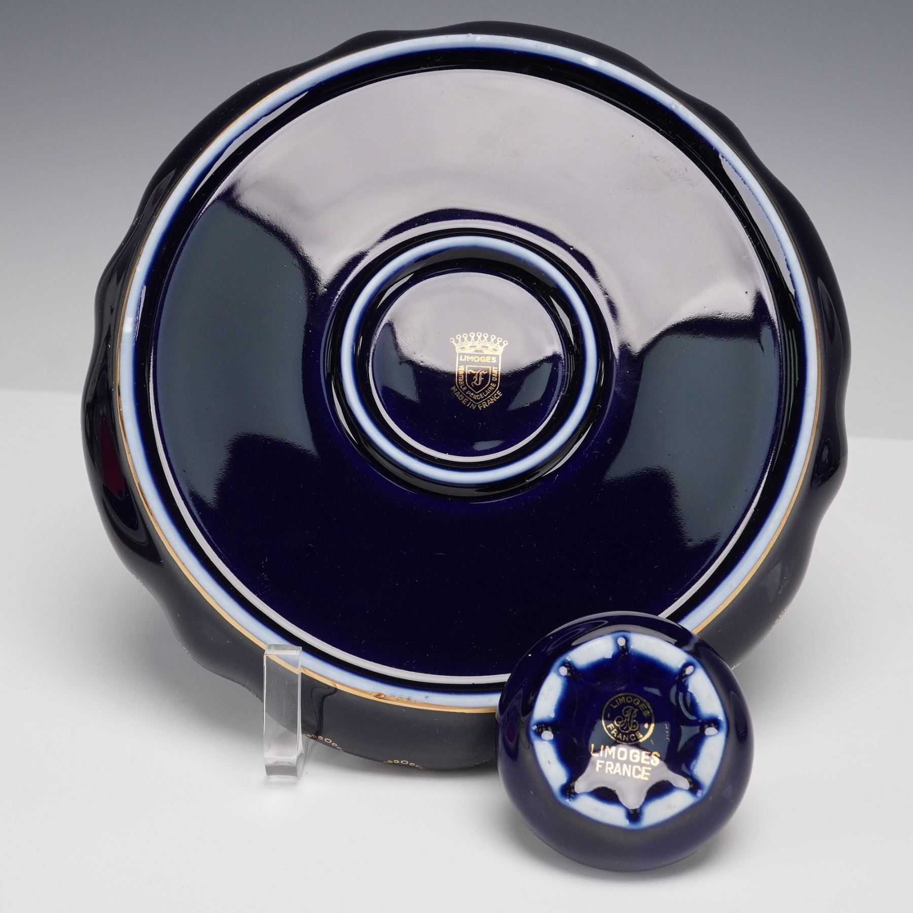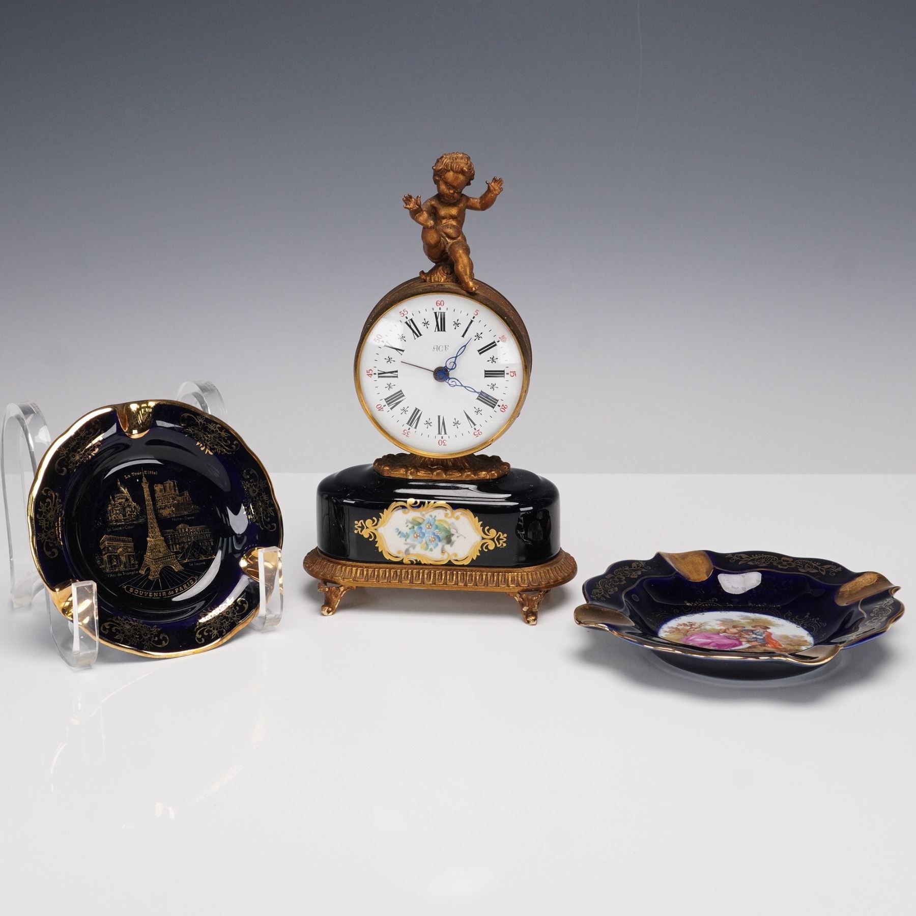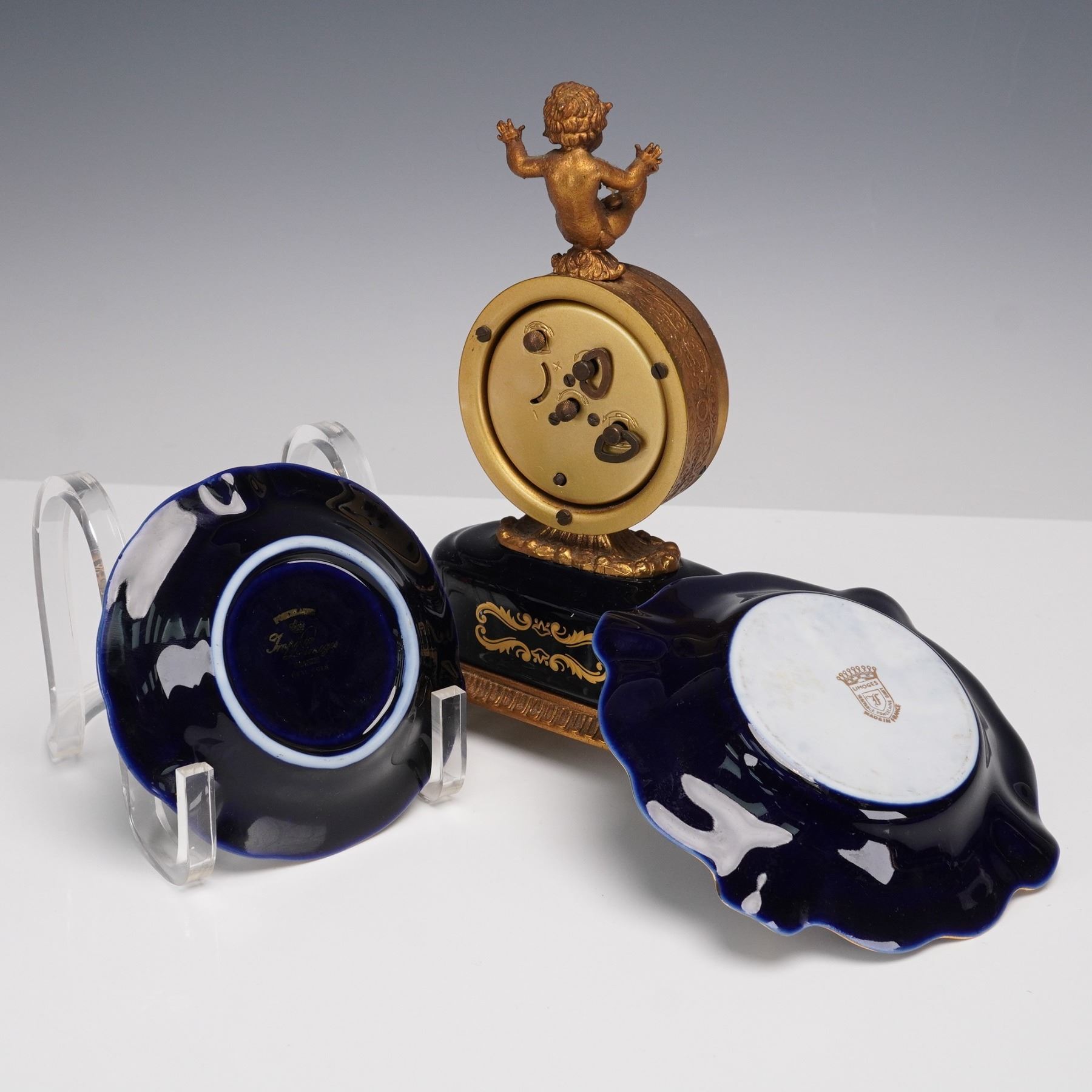 A collection of 8 Limoges porcelain table pieces made in Limoges, France, featuring hand-painted floral decoration framed by rich cobalt blue grounds and lavish gold detailing. Includes a round cabinet plate, one lidded dish, one miniature lidded box, two ashtrays, and a clock with gilt bronze cherub finial. Each piece bears the "Veritable Cobalt" mark and "Made in France" backstamp, with elegant 20th-century Limoges craftsmanship throughout. Largest piece measures 0.5"H x 12"dia. Tallest piece measures 8.5"H.