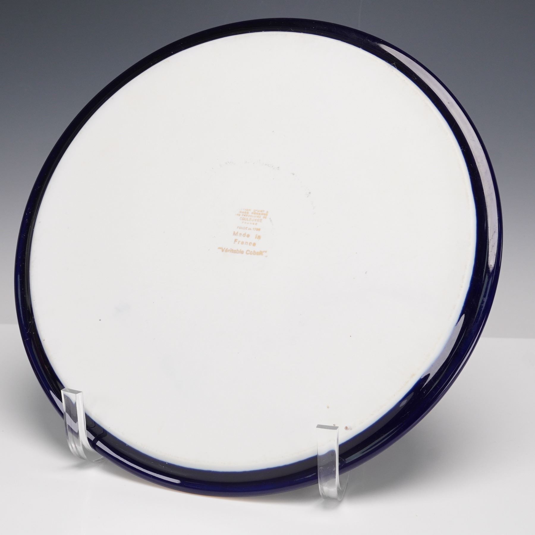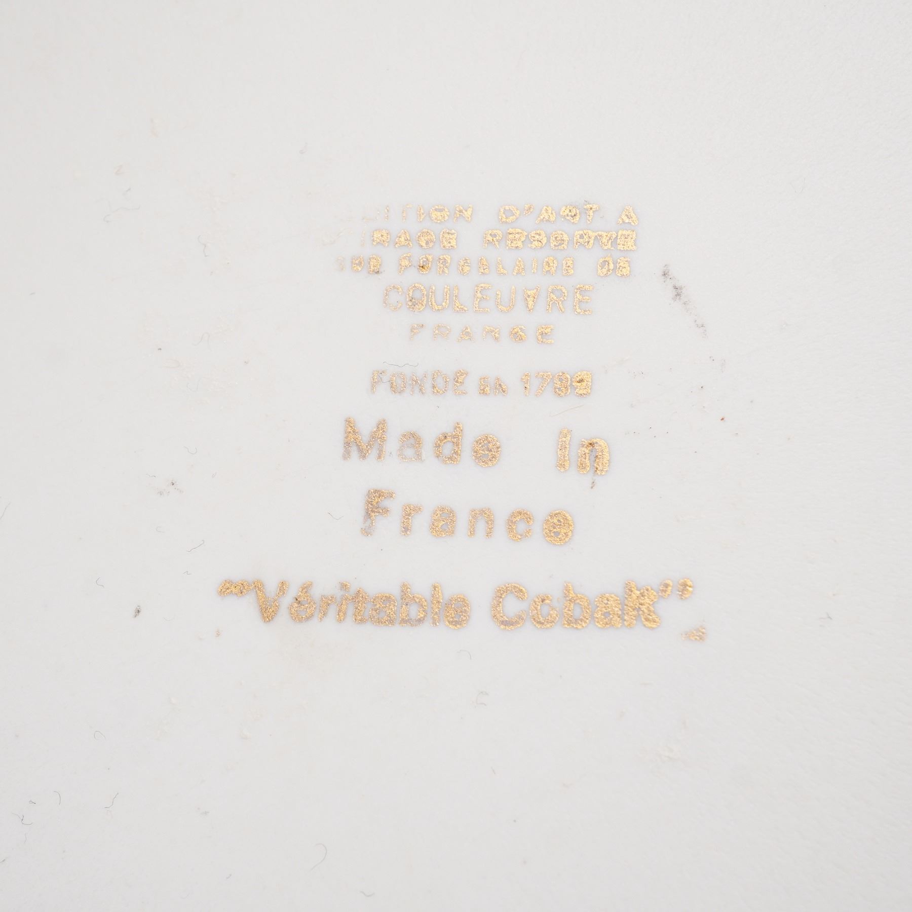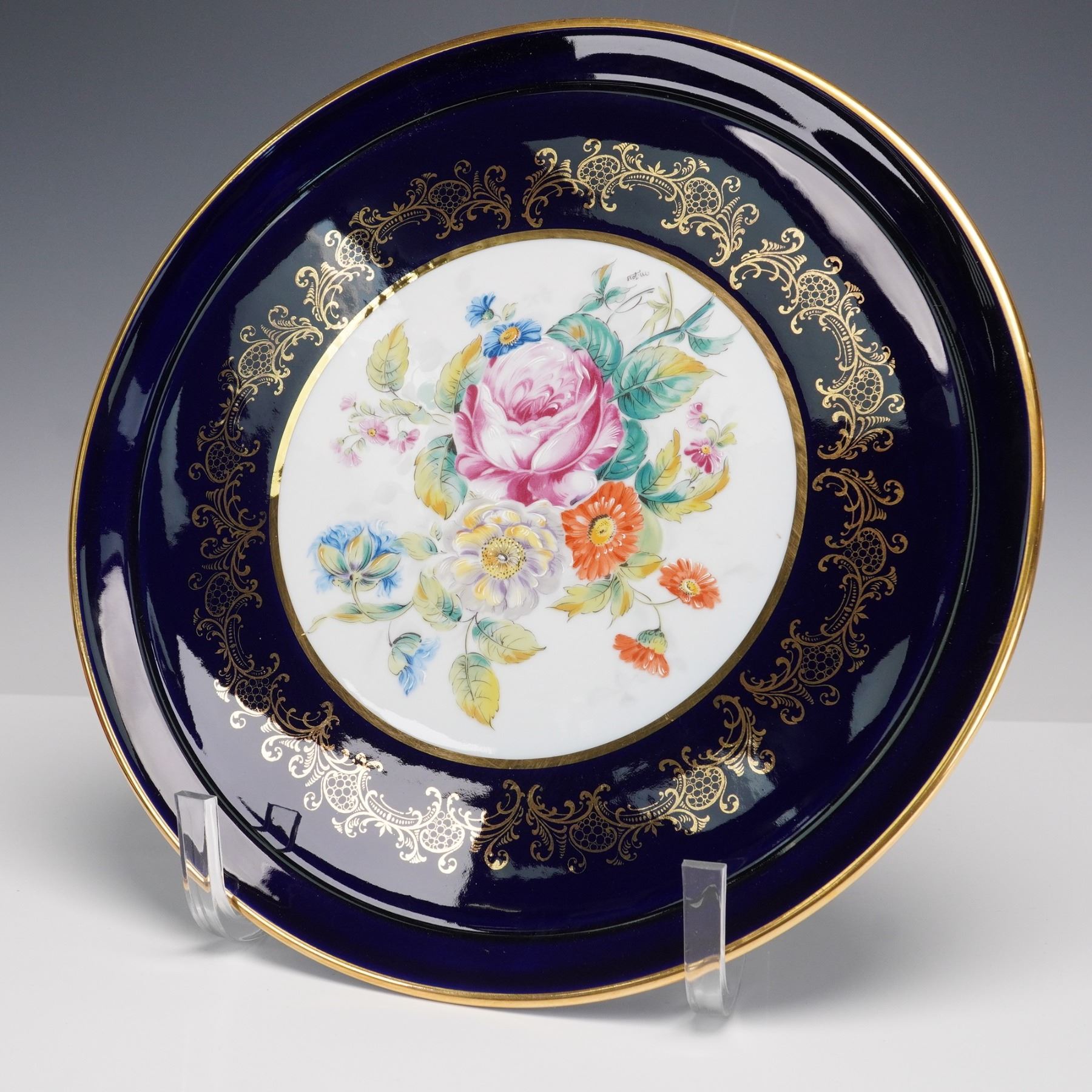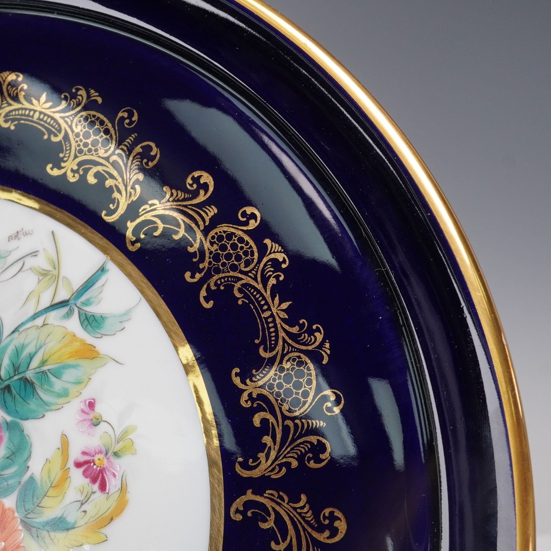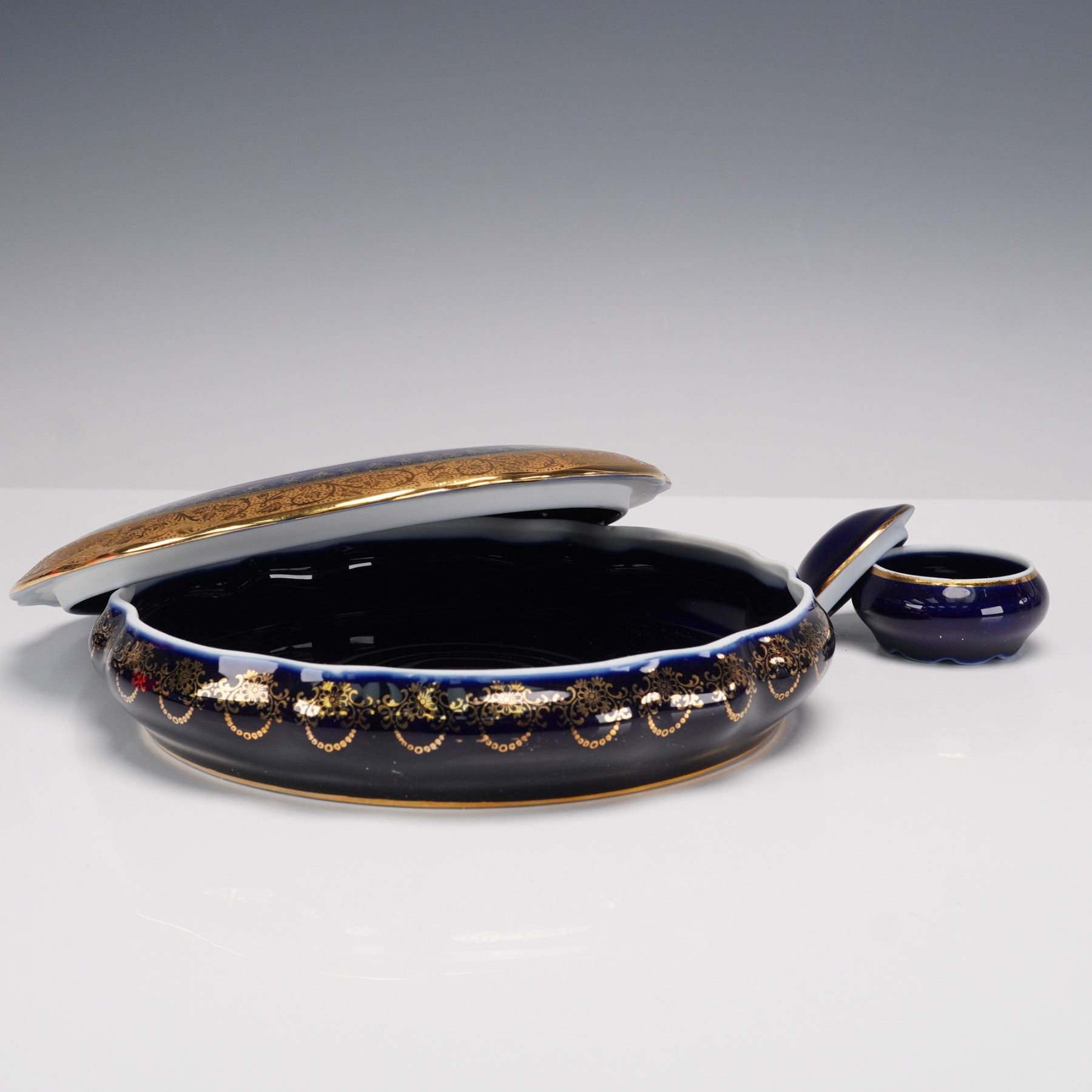 A collection of 8 Limoges porcelain table pieces made in Limoges, France, featuring hand-painted floral decoration framed by rich cobalt blue grounds and lavish gold detailing. Includes a round cabinet plate, one lidded dish, one miniature lidded box, two ashtrays, and a clock with gilt bronze cherub finial. Each piece bears the "Veritable Cobalt" mark and "Made in France" backstamp, with elegant 20th-century Limoges craftsmanship throughout. Largest piece measures 0.5"H x 12"dia. Tallest piece measures 8.5"H.