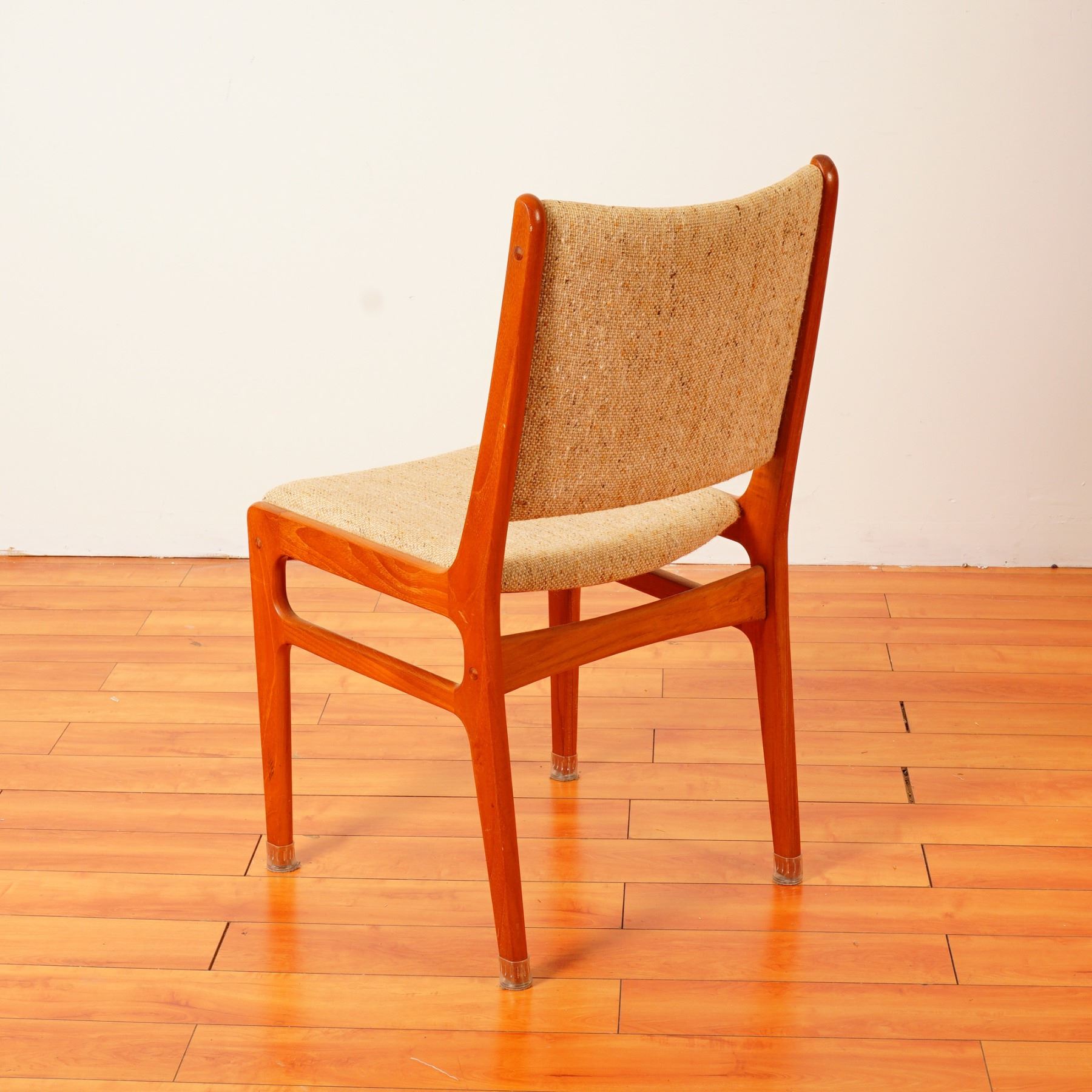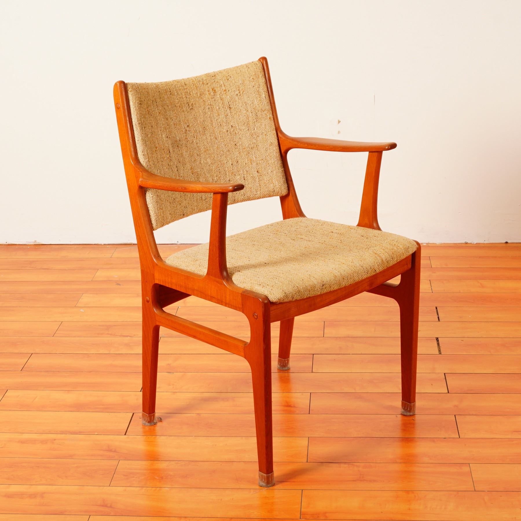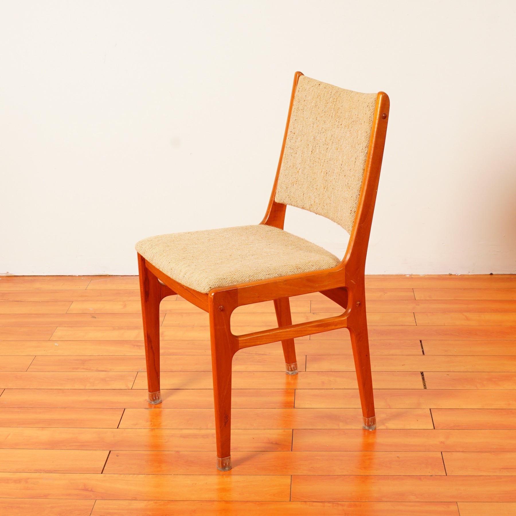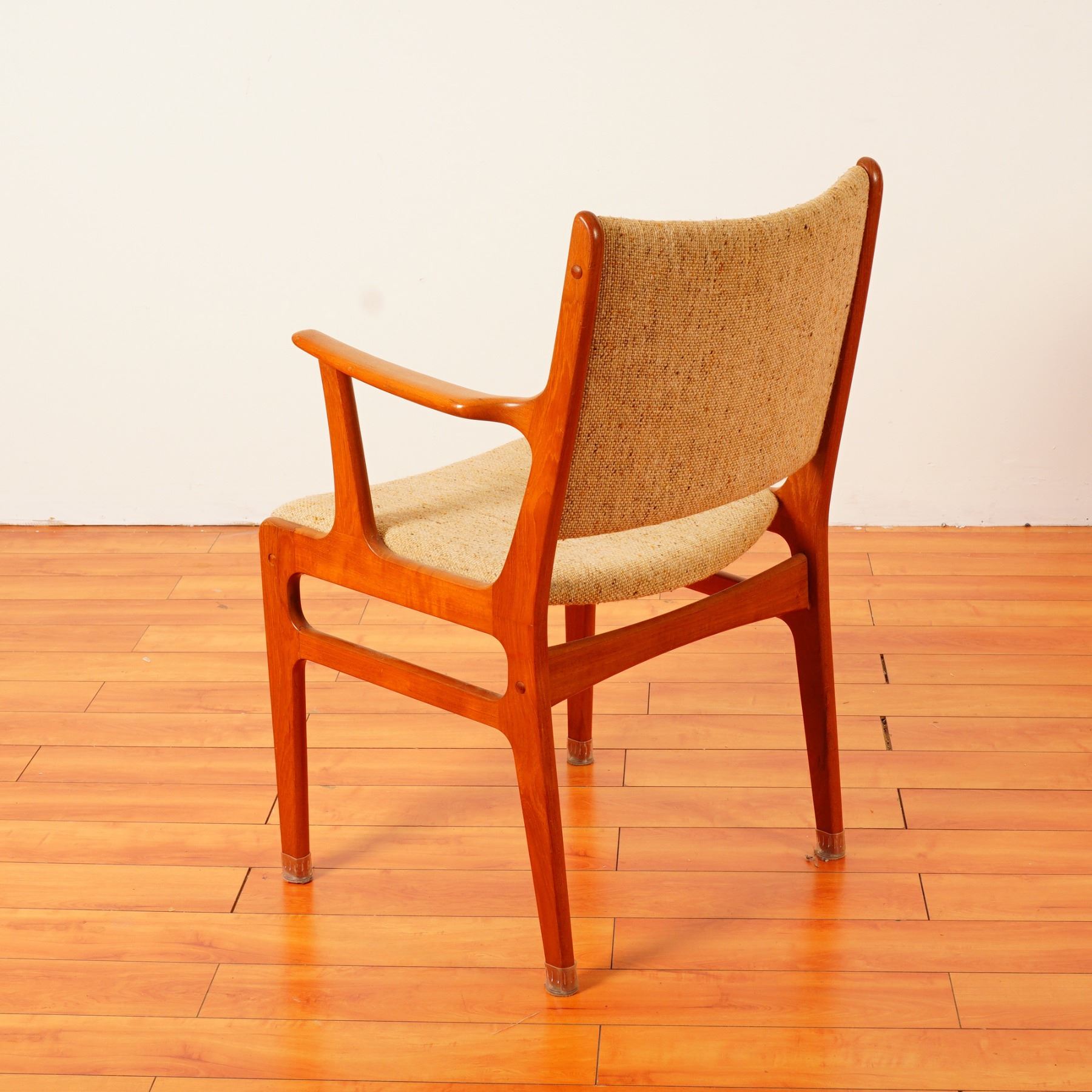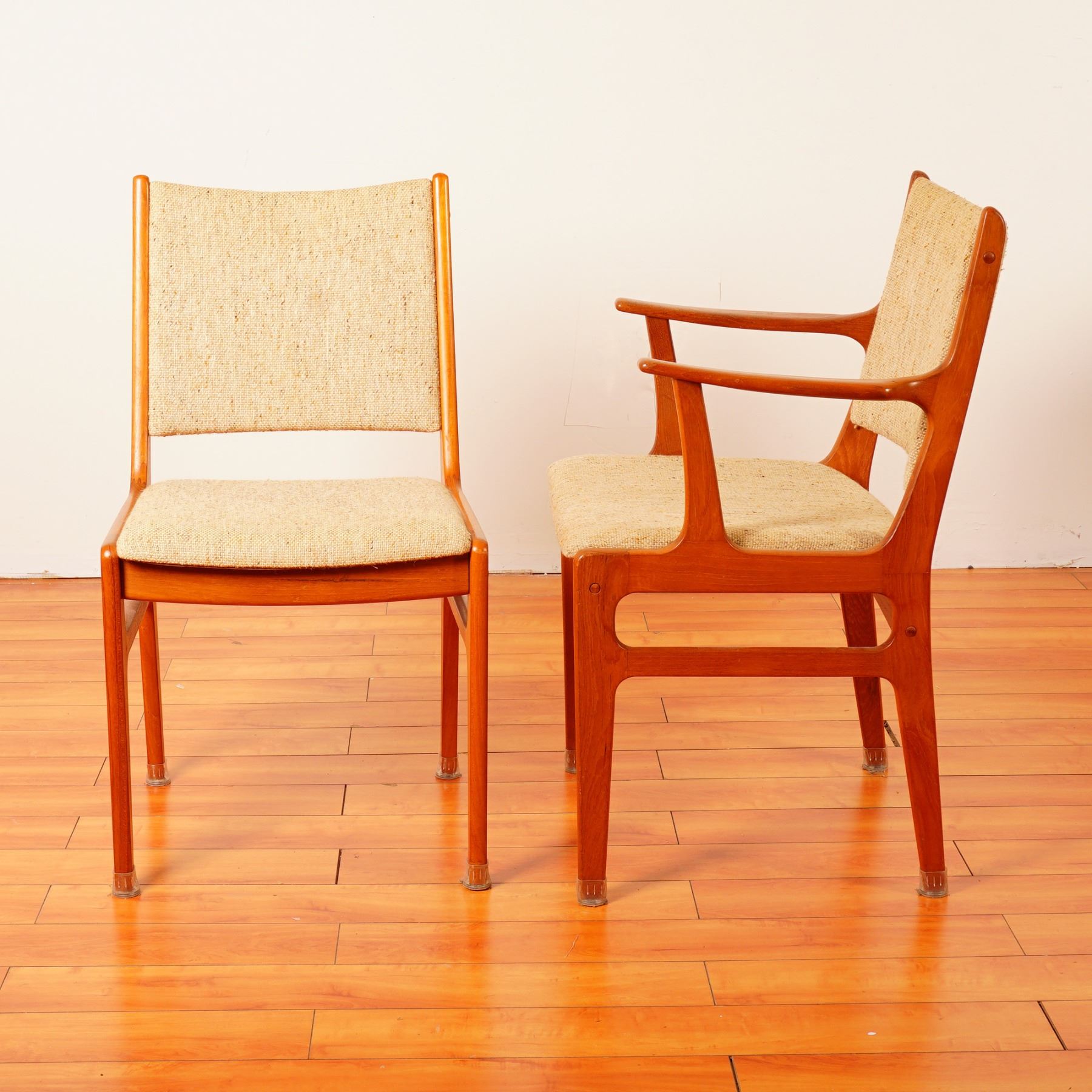 A stylish mid century dining set in the Danish modern style, featuring sleek wood frames and timeless Scandinavian-inspired lines. This eight-piece ensemble includes an extendable dining table with one leaf, four side chairs, and two armchairs upholstered in textured beige fabric. The curved backrests, sculpted open-frame design, and warm wood tone evoke the clean craftsmanship and organic simplicity associated with mid century Scandinavian design. Perfect for collectors or anyone seeking an elegant dining centerpiece. A graceful and well-balanced example of mid century design, blending form and function with understated charm.